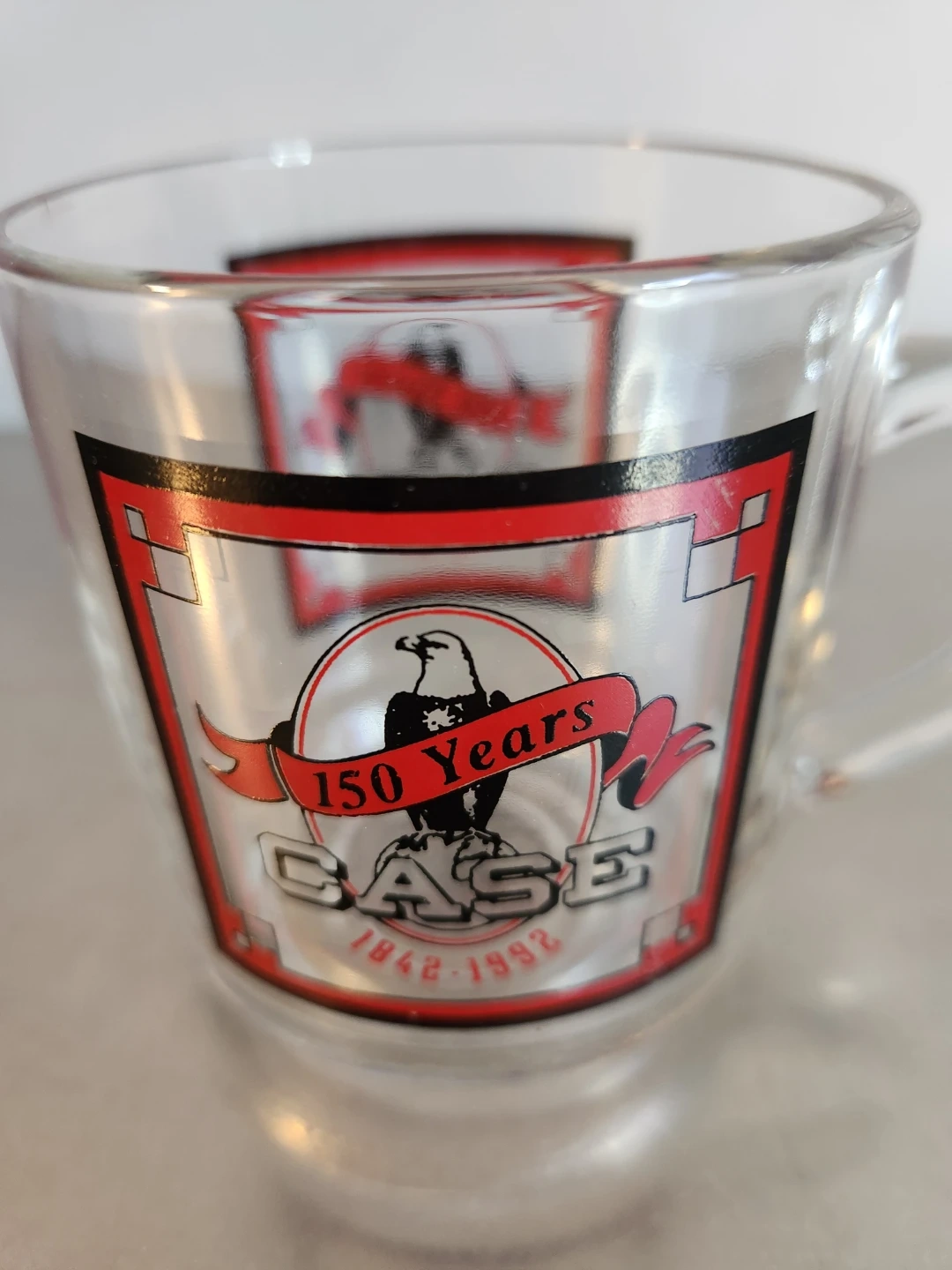 This clear glass mug celebrates CASE's 150 Years of operation, from 1842 to 1992. It's dishwasher and microwave safe. It features the CASE logo with an eagle emblem and commemorative text.