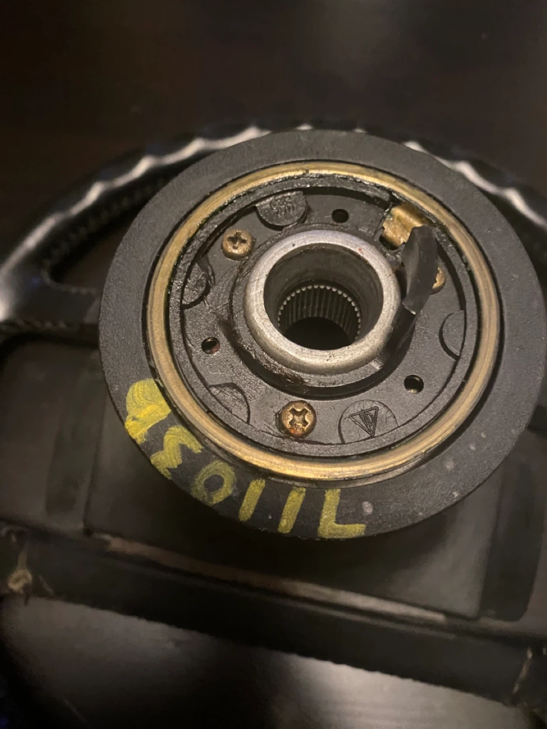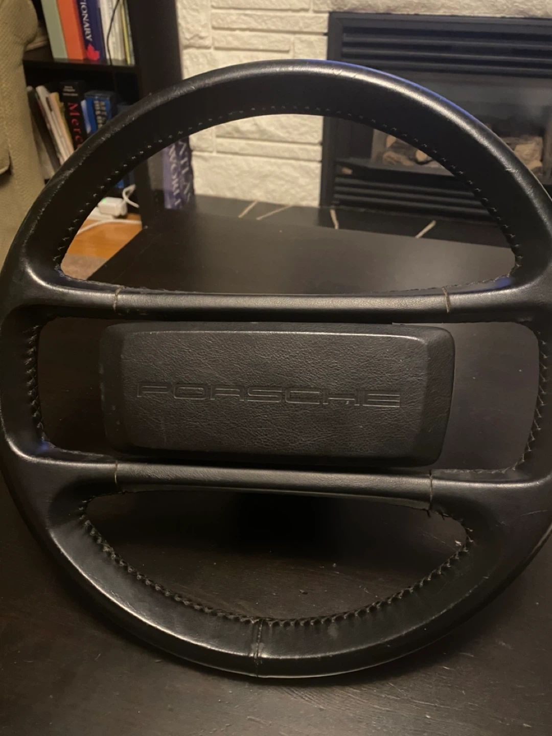 Leather-wrapped steering wheel for a Porsche. This wheel has been used and shows some wear marks on the leather. It's black with stitched detailing.