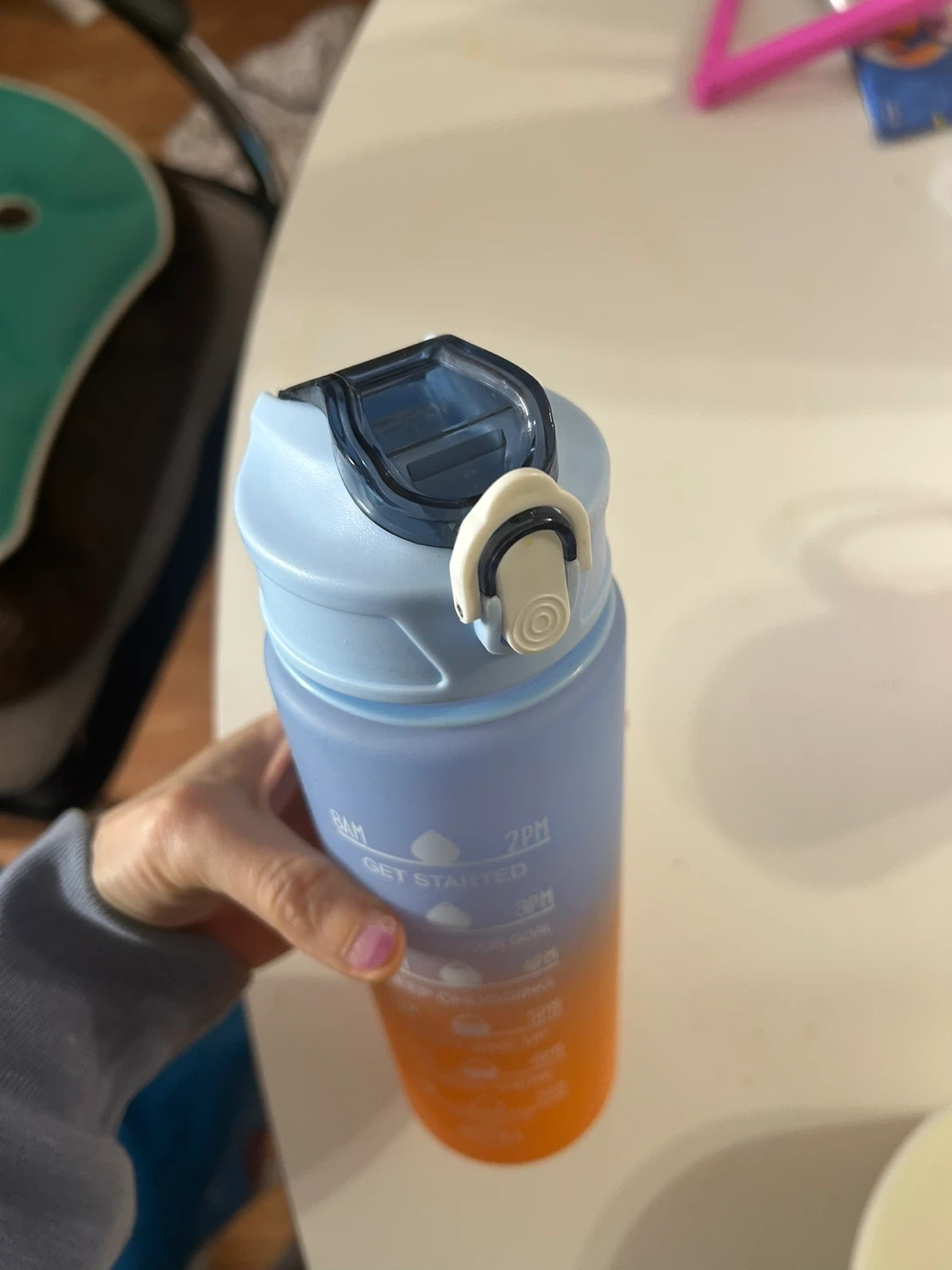 This 750ml water bottle has time markings to help you stay hydrated throughout the day. It features a convenient straw and a leak-proof lid. Great for tracking your water intake at home or on the go!