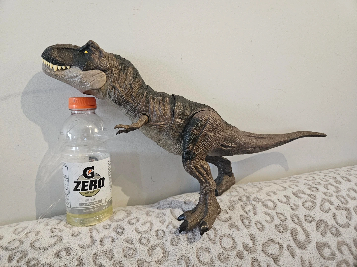 This is a Jurassic World T-Rex dinosaur toy. It's detailed with realistic coloring and textures. It's a great toy for dinosaur enthusiasts of all ages!