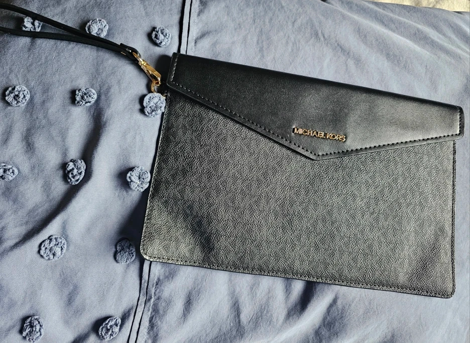 Here's a stylish black leather wristlet from Michael Kors! It's in great condition and perfect for carrying your essentials when you don't want to lug around a big purse