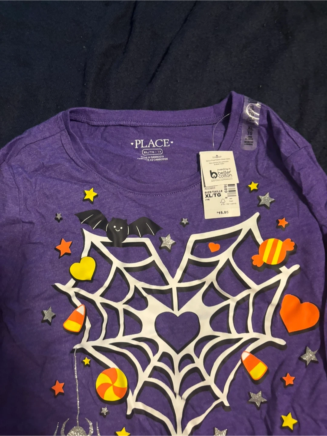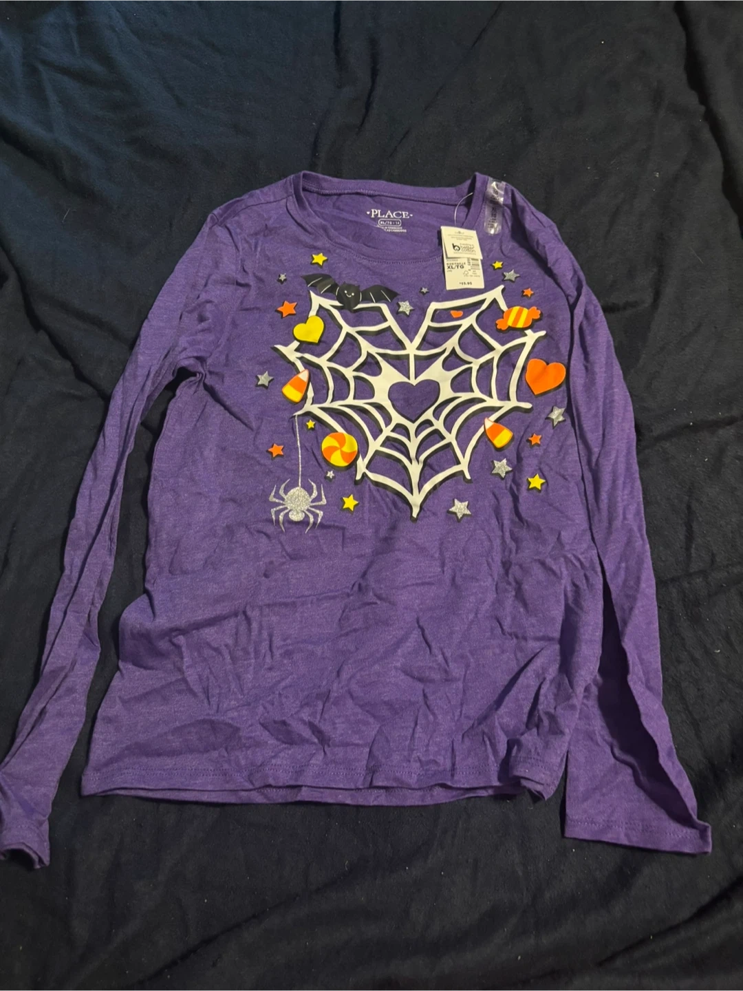 This is a new with tags The Children's Place Halloween long sleeve shirt. It is purple and size XL (14). It has a spiderweb heart design with candy corn and other Halloween themed images. It was originally $15.95