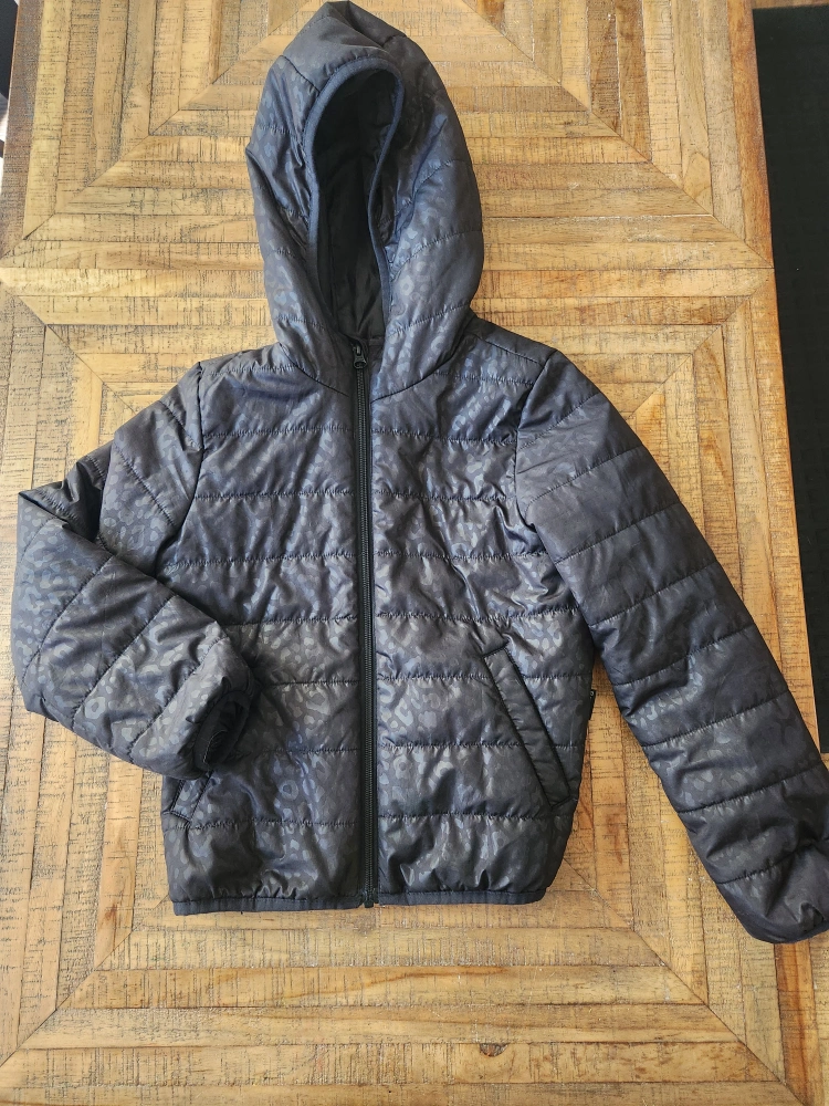 Lightweight hooded puffer jacket. Features a zipper closure and a subtle leopard print. Great for layering.