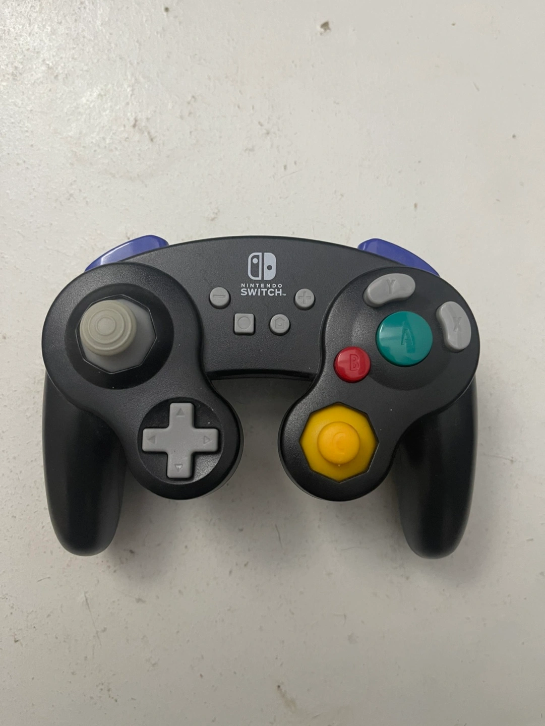 Black GameCube controller. Compatible with Nintendo Switch. Features standard GameCube button layout. No wire.