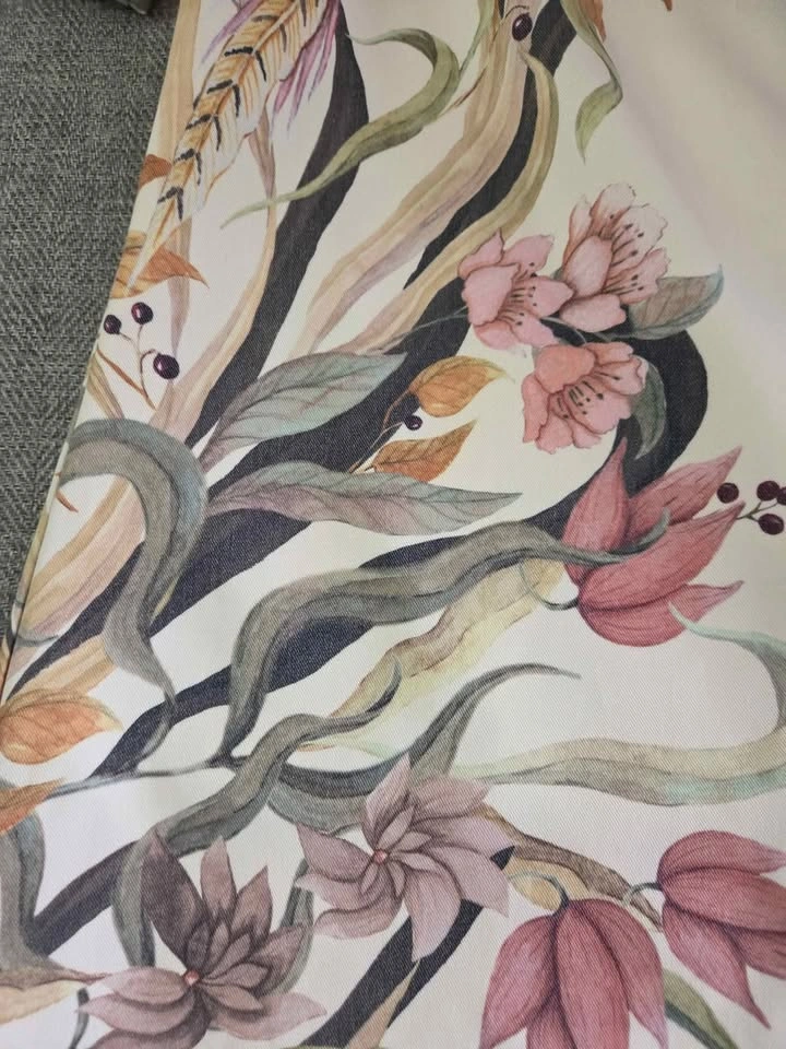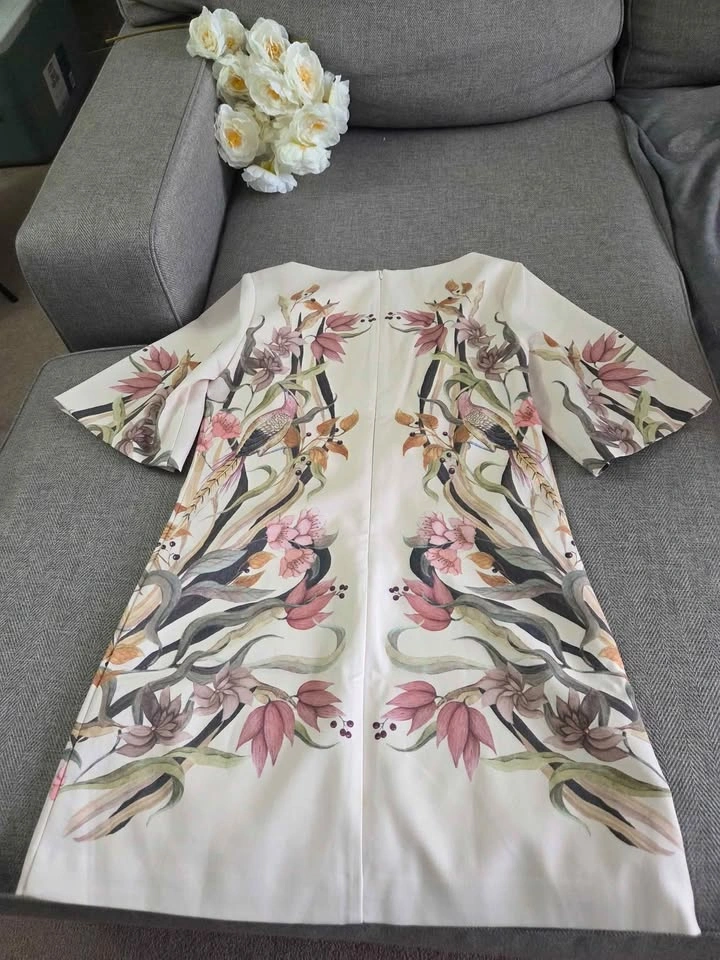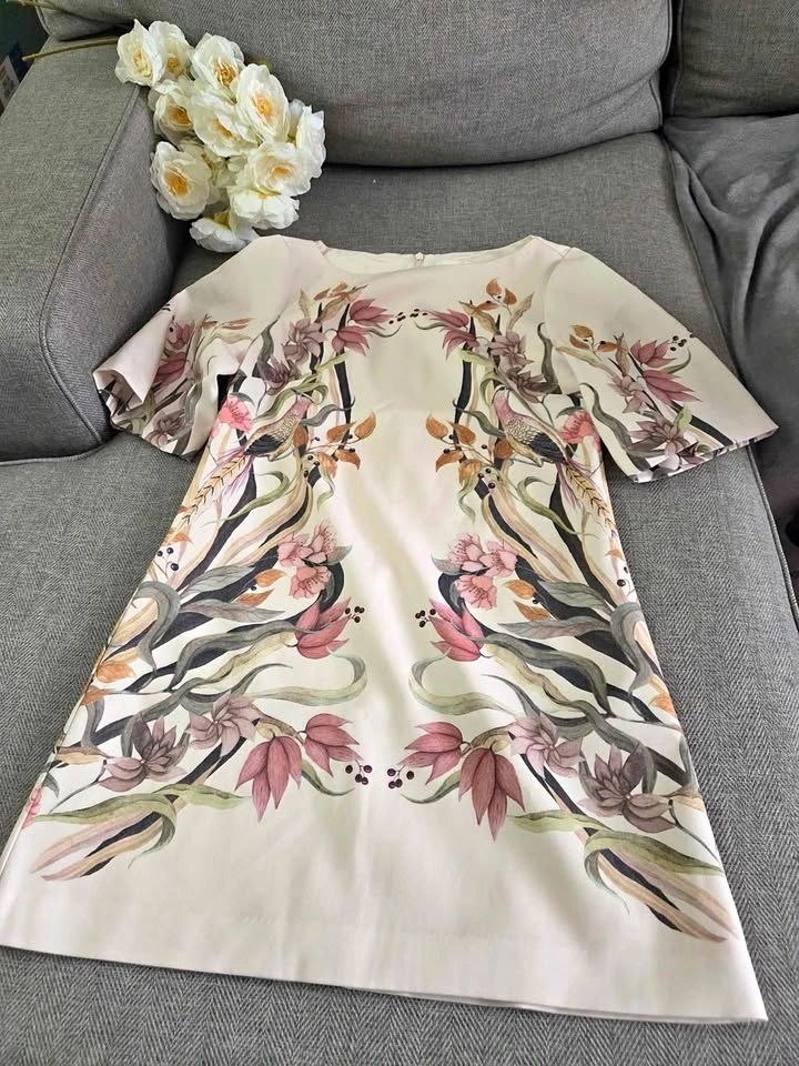 Beautiful straight-cut dress with a refined floral and bird print. Lightweight fabric, comfortable length, and short sleeves make it a perfect choice for both everyday wear and special occasions.