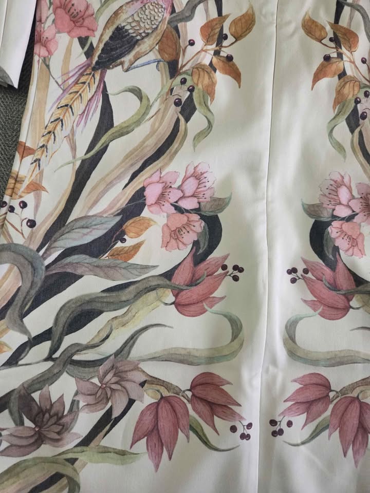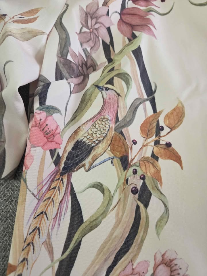Beautiful straight-cut dress with a refined floral and bird print. Lightweight fabric, comfortable length, and short sleeves make it a perfect choice for both everyday wear and special occasions.