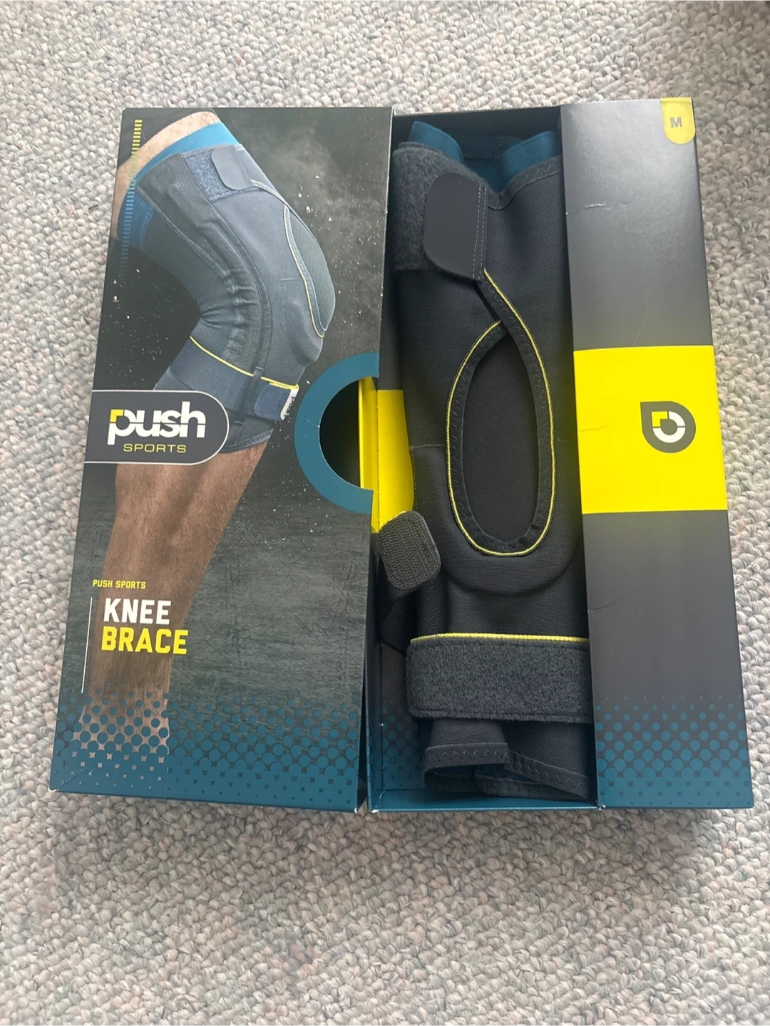 Push Sports knee brace in size M. This brace provides support and stability for your knee. It's designed for comfort during physical activity. Brand new pick up cash only