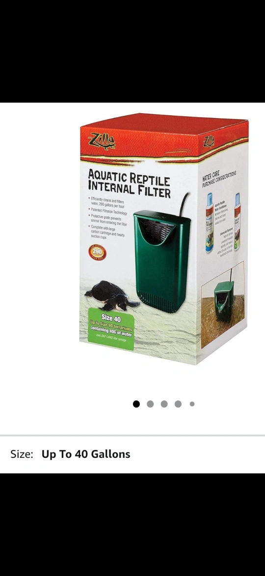 Aquatic Reptile Internal Filter! It efficiently cleans and filters water at 290 gallons per hour. It also has patented filtration technology and a protective grate to prevent animals from entering the filter. This filter is complete with a large carbon cartridge and hearty suction cups, and it's sized for up to 40-gallon tanks