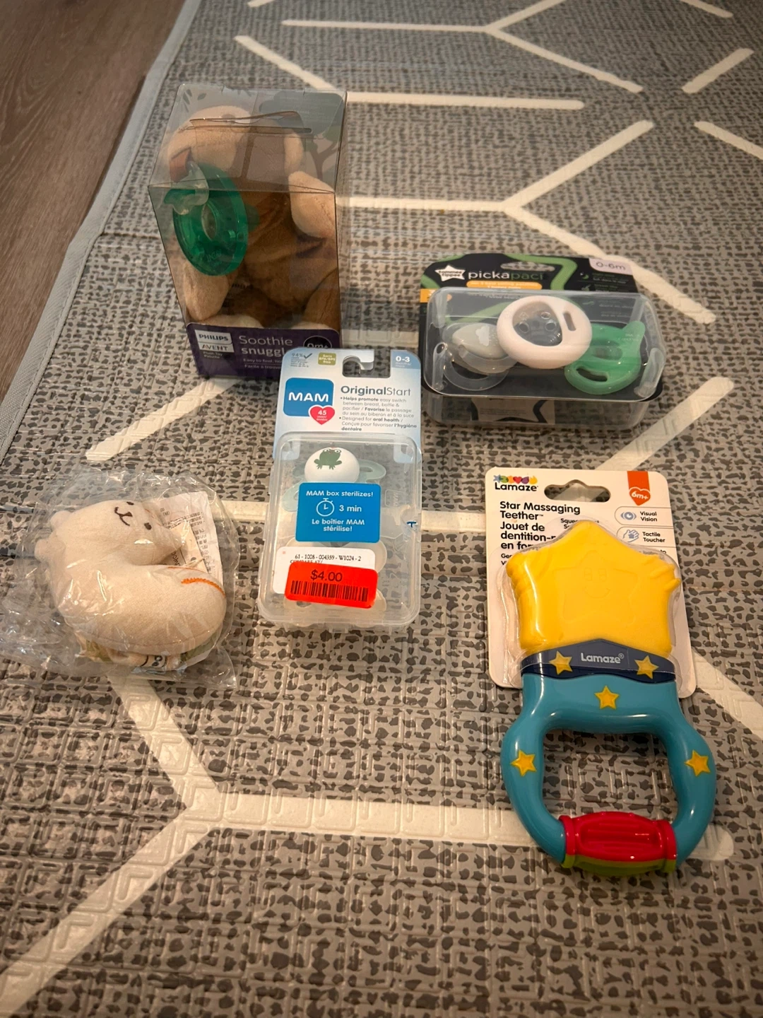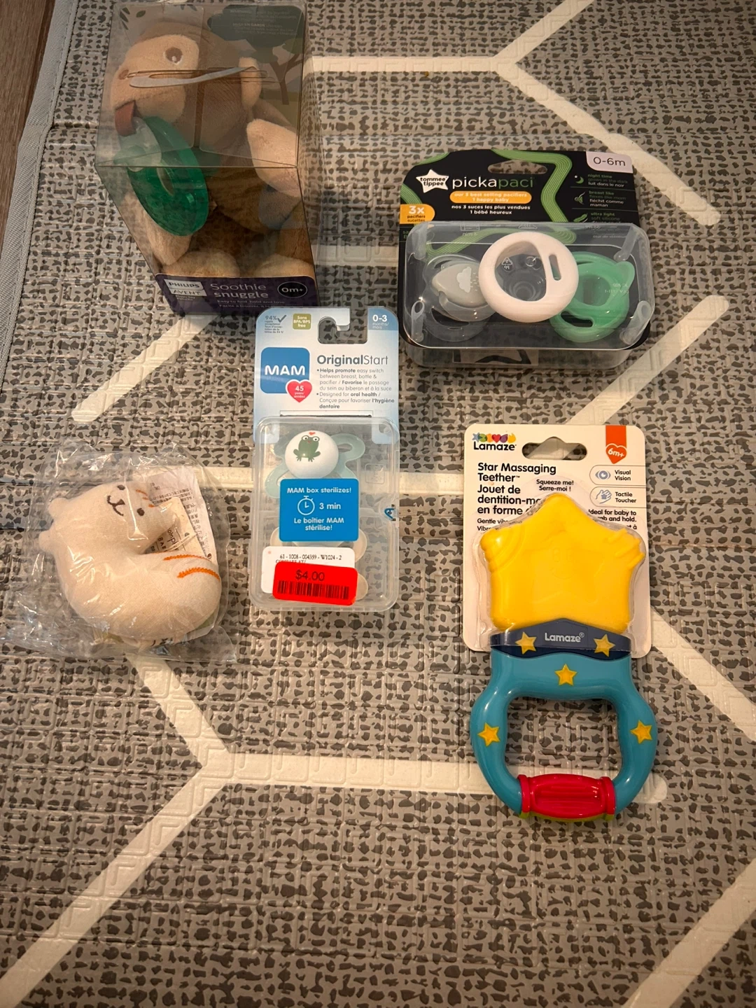 Bundle includes a Philips Soothie Snuggle, a Mam Original Start pacifier set, a Tommee Tippee pacifier set, and a Lamaze Star Massaging Teether. Great for soothing and teething babies.