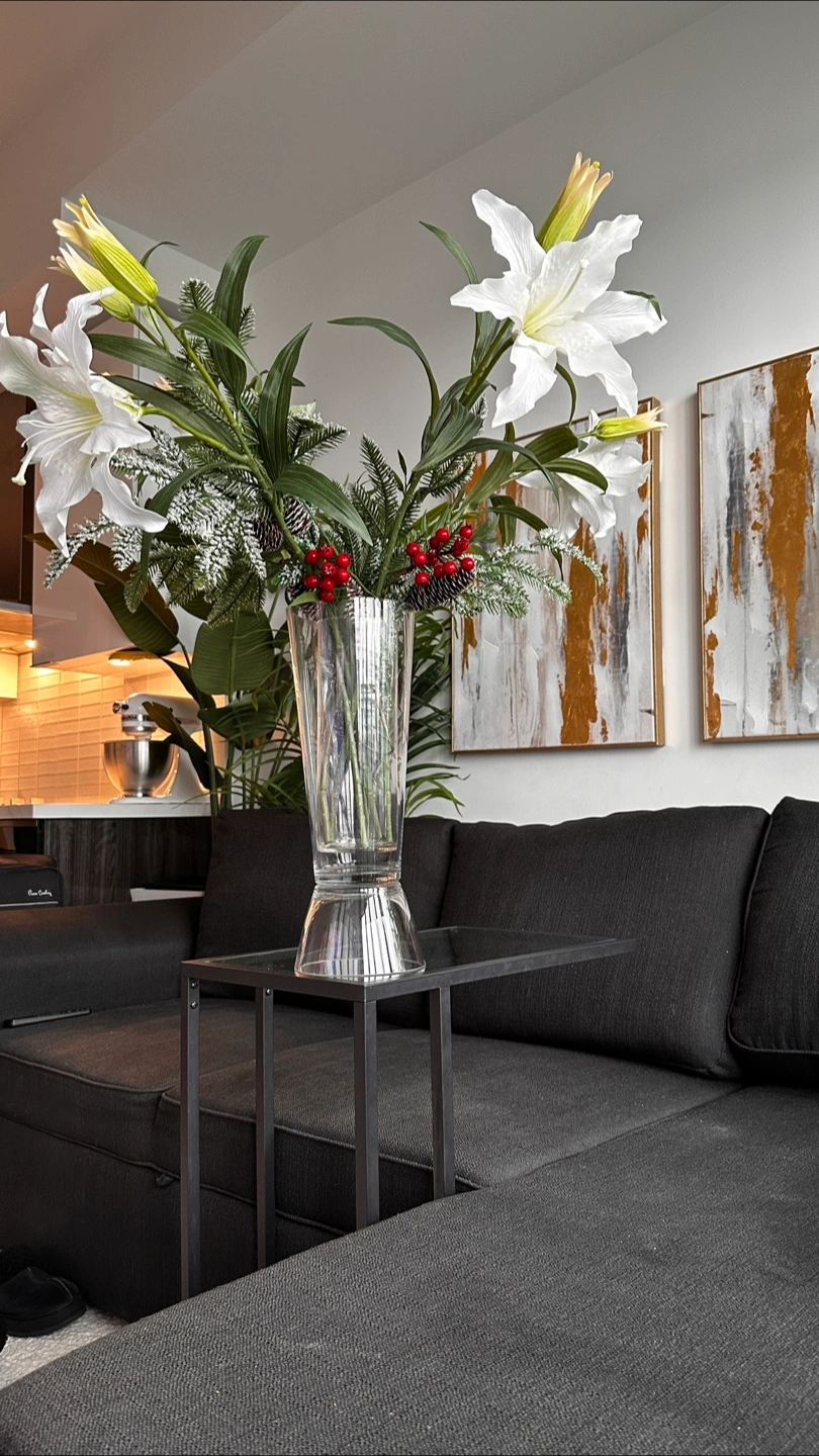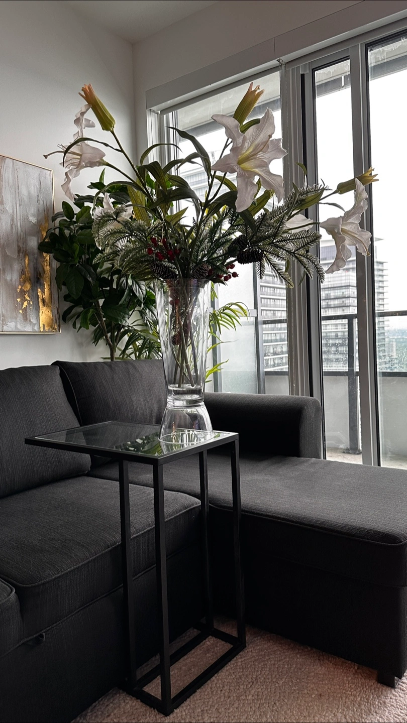 Selling a stylish side table featuring a sleek metal frame and a clear glass top. It's in great condition and would be a perfect addition to any living room or bedroom. The table is sturdy and provides a convenient surface for drinks, books, or decor