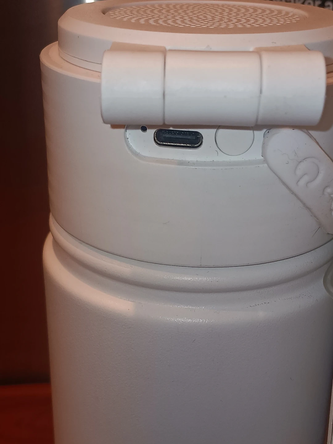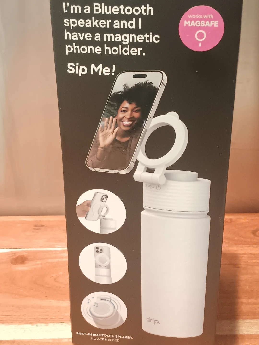 This white Drip. water bottle features a built-in Bluetooth speaker and magnetic phone holder. It keeps drinks cold for 24 hours or hot for 12 hours and is leakproof. The bottle is BPA free and has up to 4 hours of playtime. It's compatible with MagSafe.