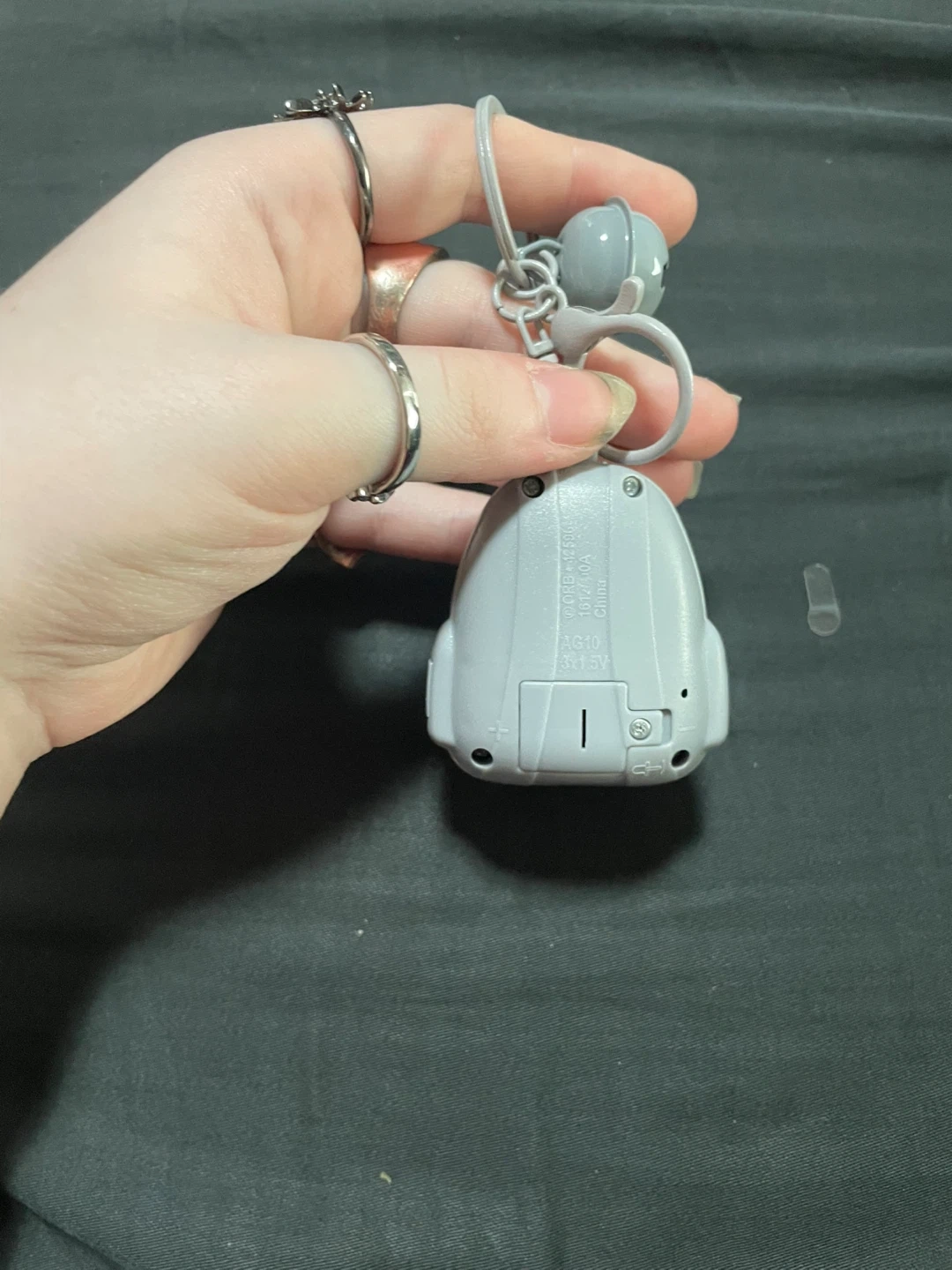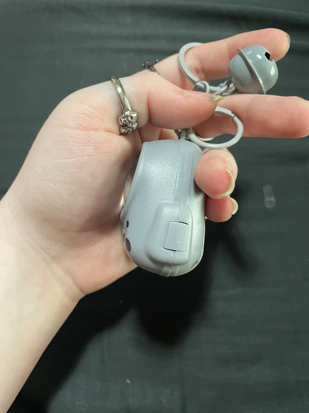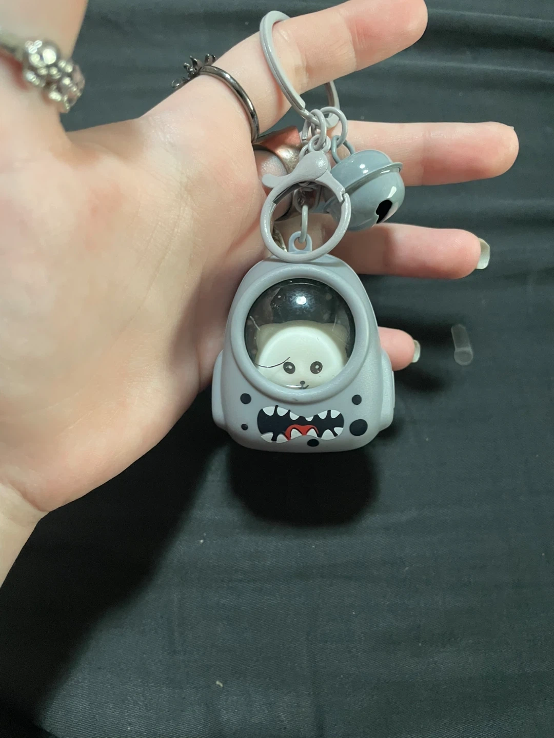 This is a fun keychain featuring a cute astronaut cat with a light-up feature! It has a playful monster mouth design and a little bell accessory. It's a great little gadget to add some personality to your keys or backpack.