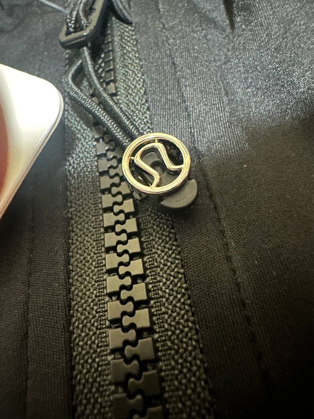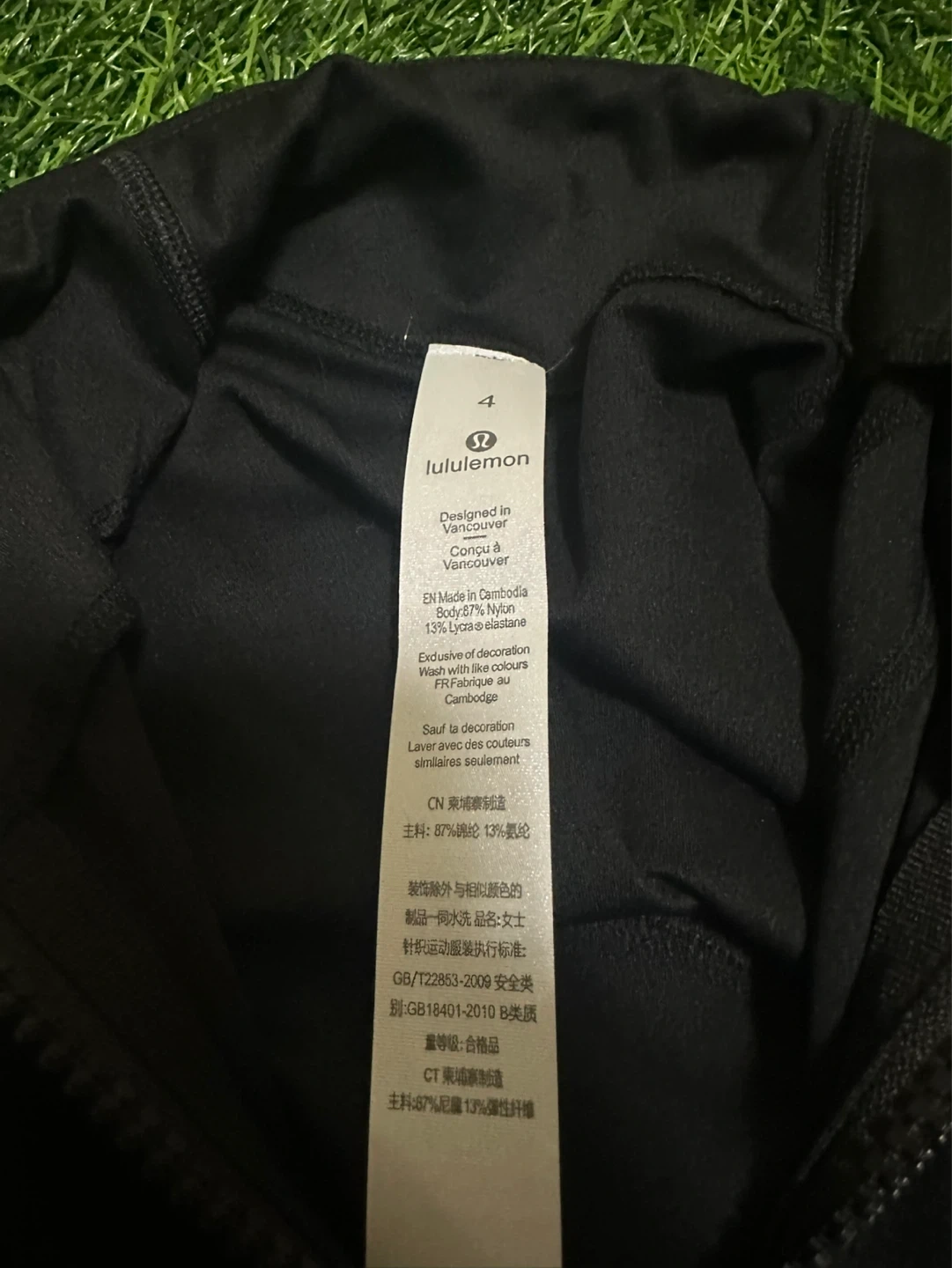 This Lululemon jacket is black and made of 87% nylon and 13% Lycra elastane. It's designed in Vancouver and made in Cambodia. It has thumbholes at the cuffs for extra comfort.