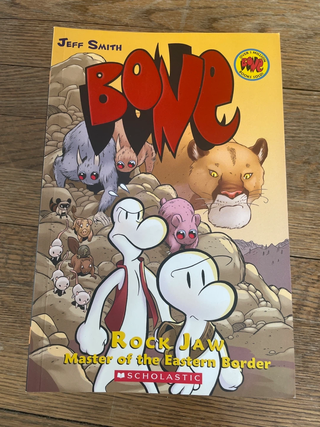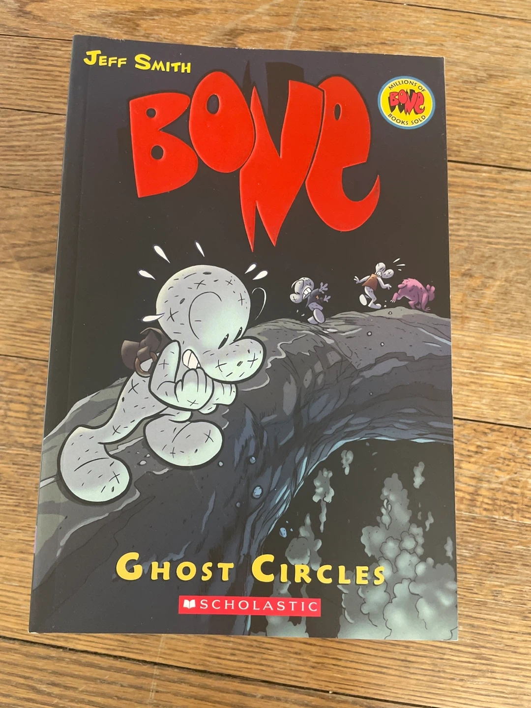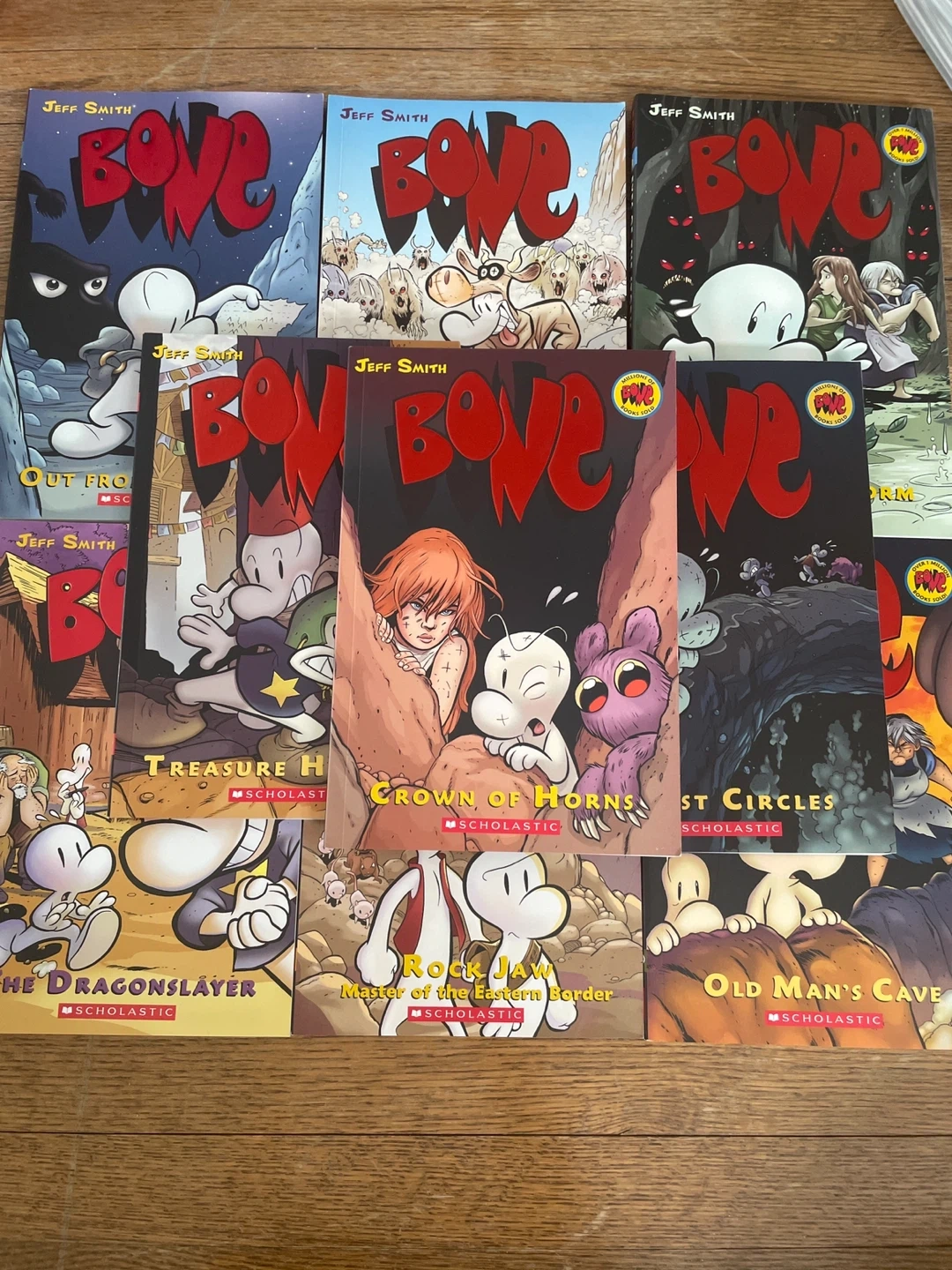 A collection of Jeff Smith's BONE graphic novels. Includes 'The Dragonslayer', 'Eyes of the Storm', 'The Great Cow Race', 'Out From Boneville', and more. Published by Scholastic. Great for fantasy lover.