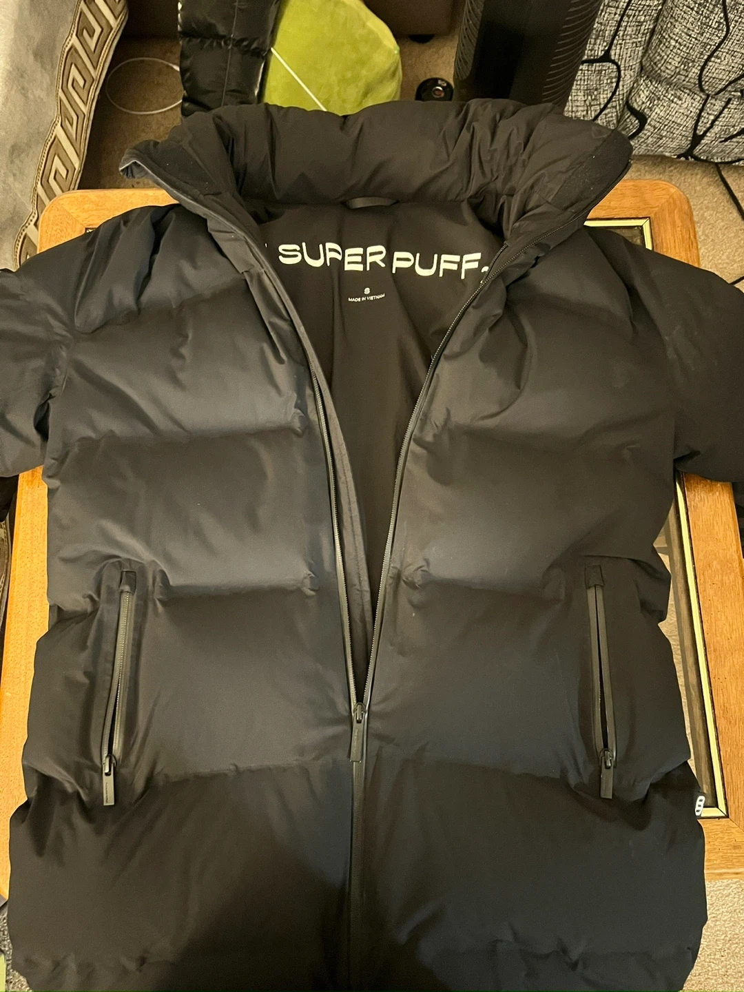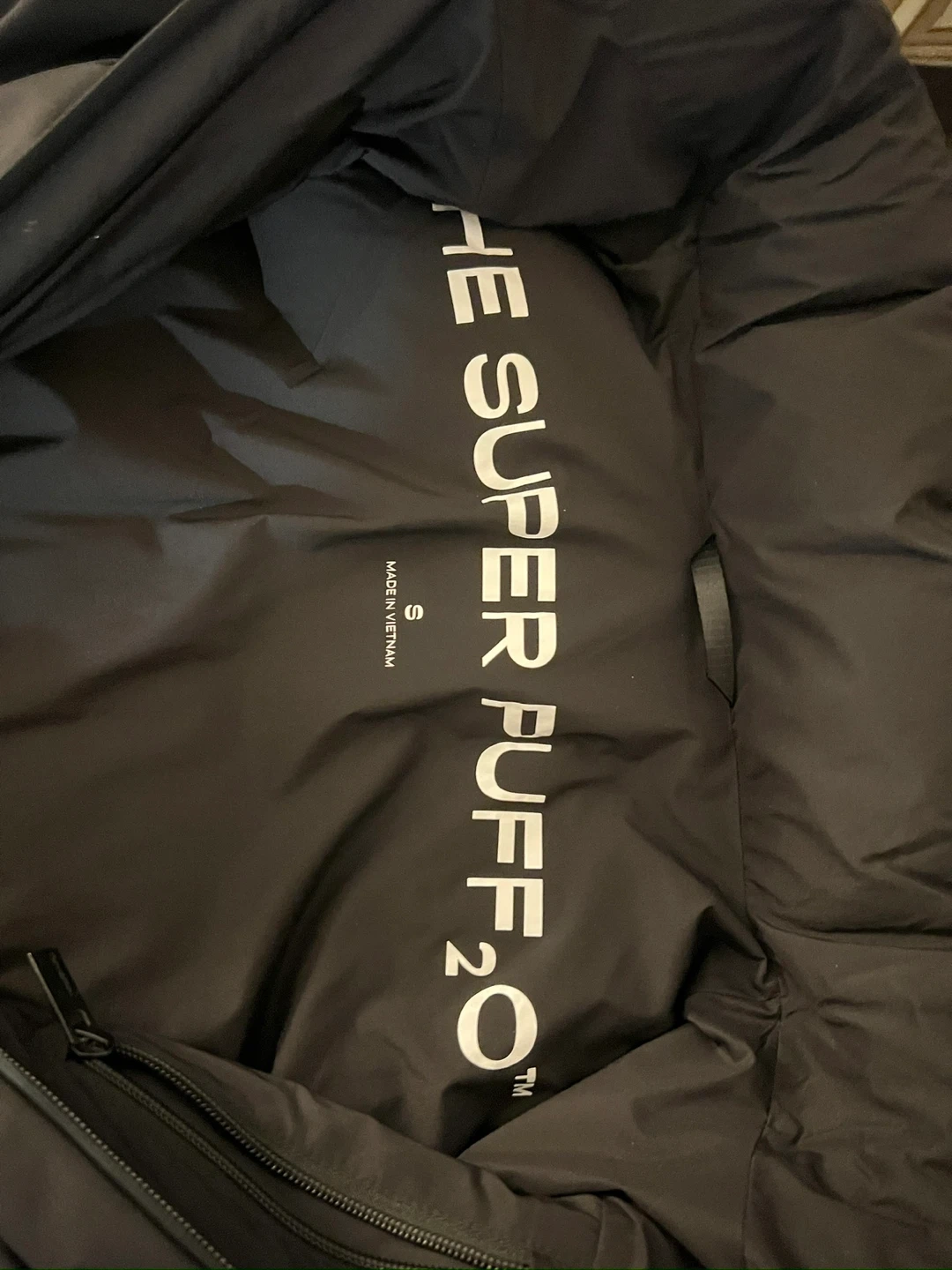 The Super Puff 2.0 puffer jacket in black. It's a size small. This jacket's design offers excellent warmth.