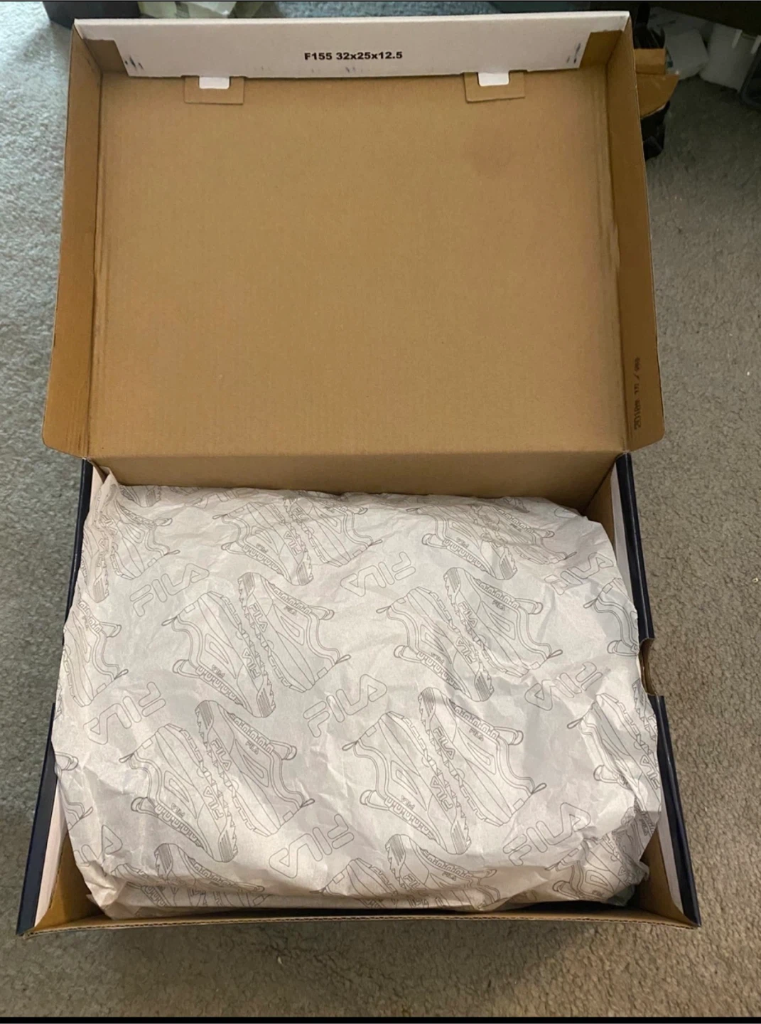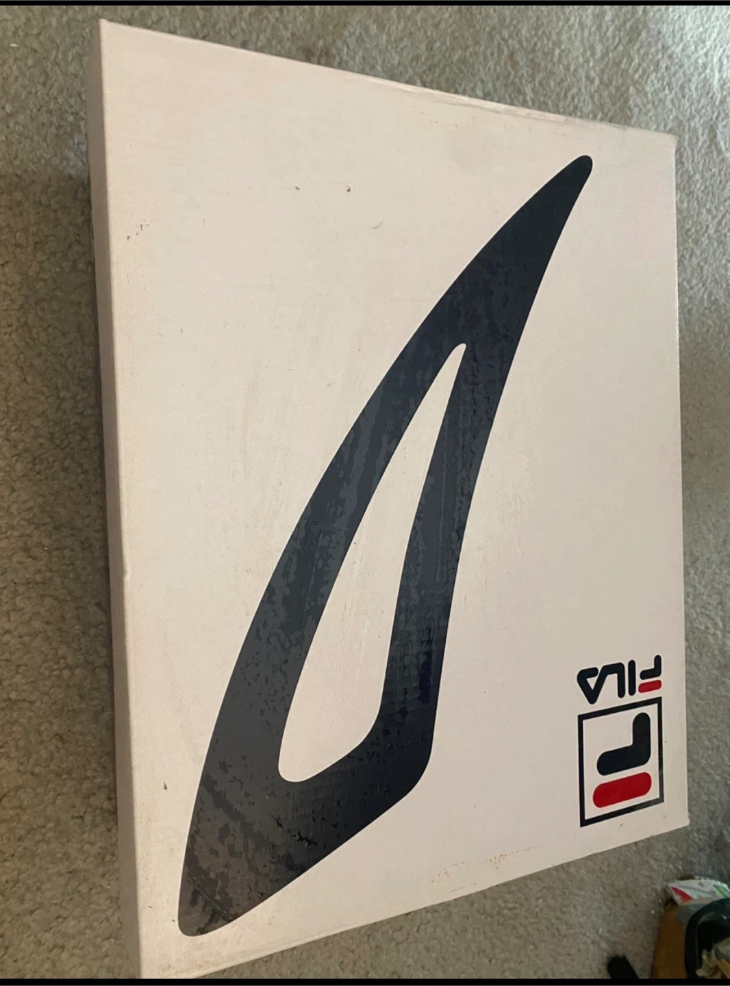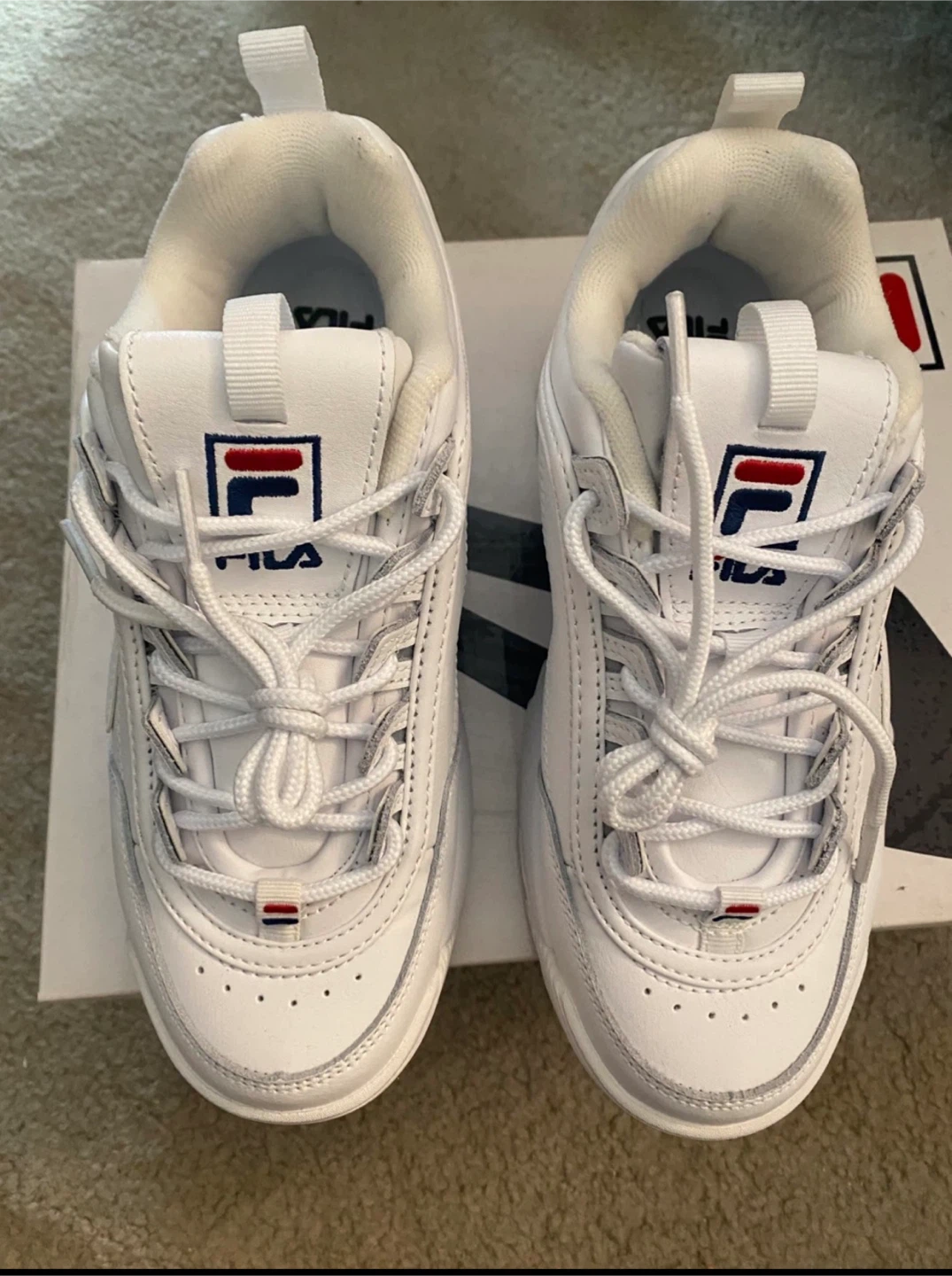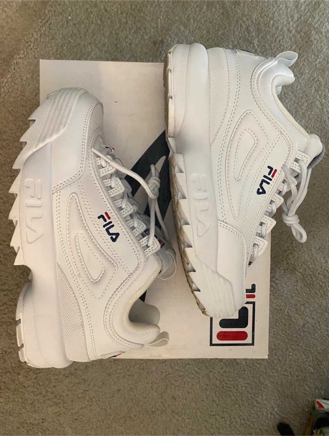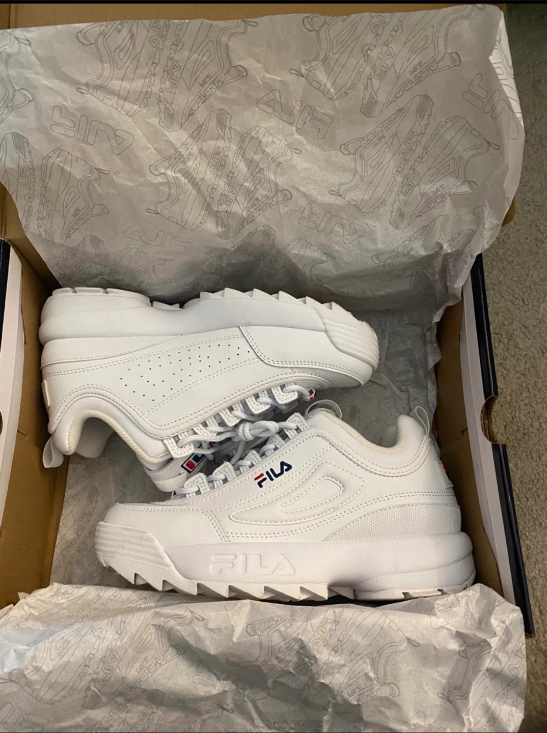 Women's White Fila Disruptor II chunky sneakers. Features lace-up closure and the iconic Fila logo. Comes with original box and shoe paper. White leather material.