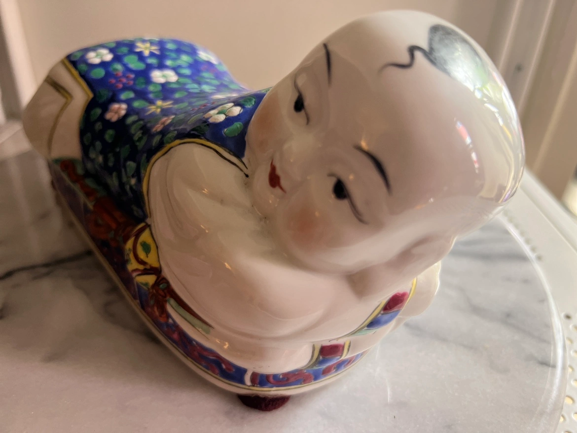 Vintage porcelain pillow figurine of a young boy wearing traditional clothing. The figurine is in a reclining position with a gold bell in his hand.