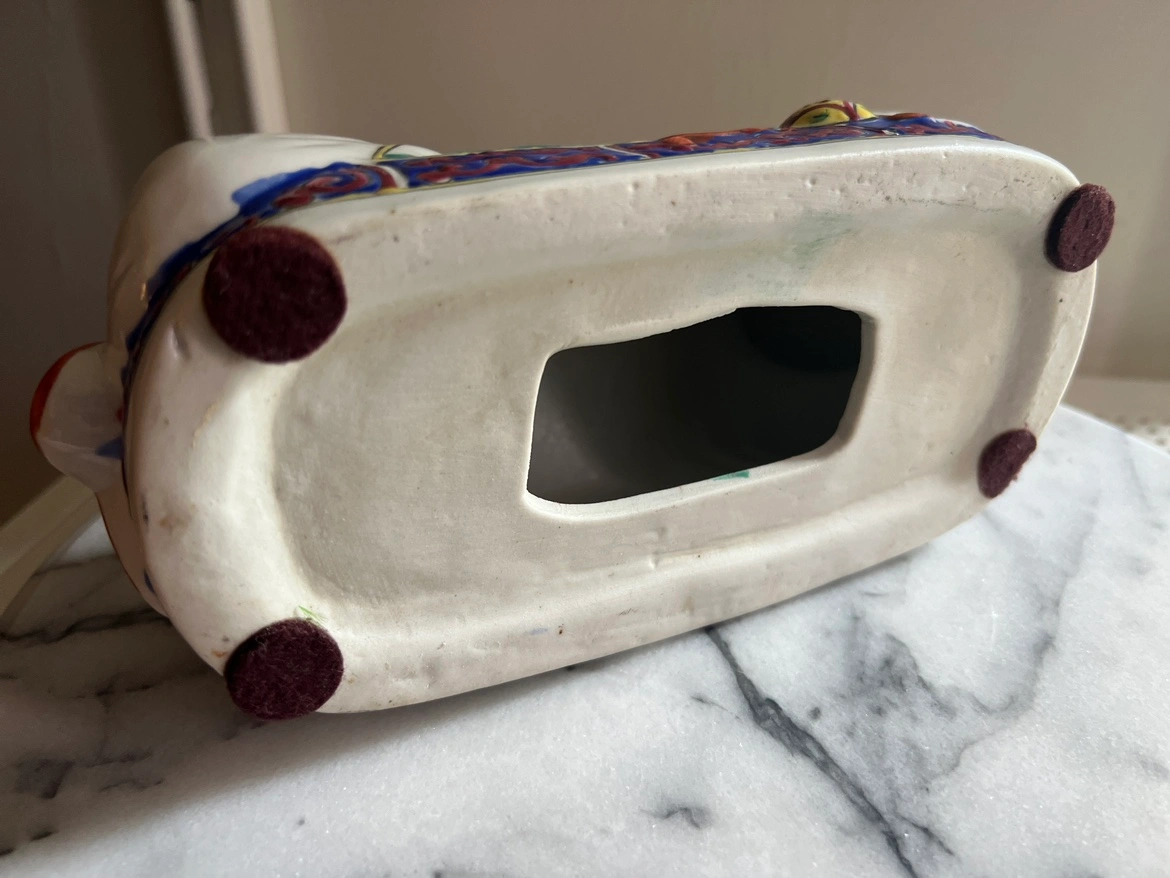 Porcelain pillows first appeared during the Sui Dynasty (581-618). This one was likely produced in the 1980’s and directly imported since it is not stamped with the country of origin.