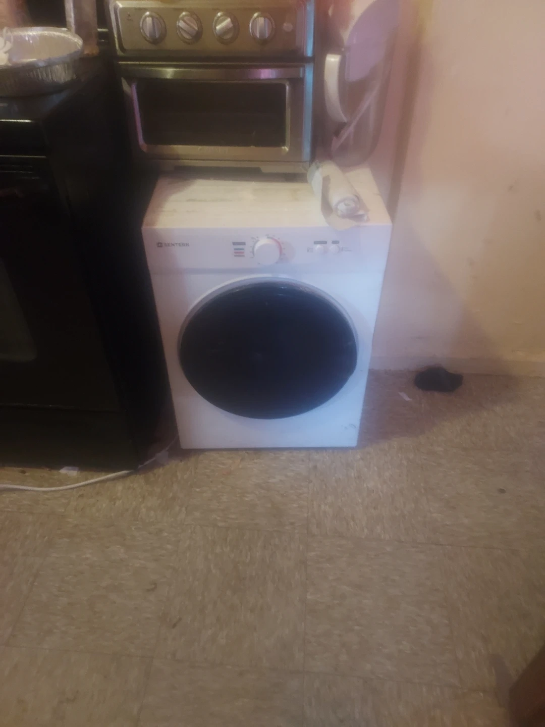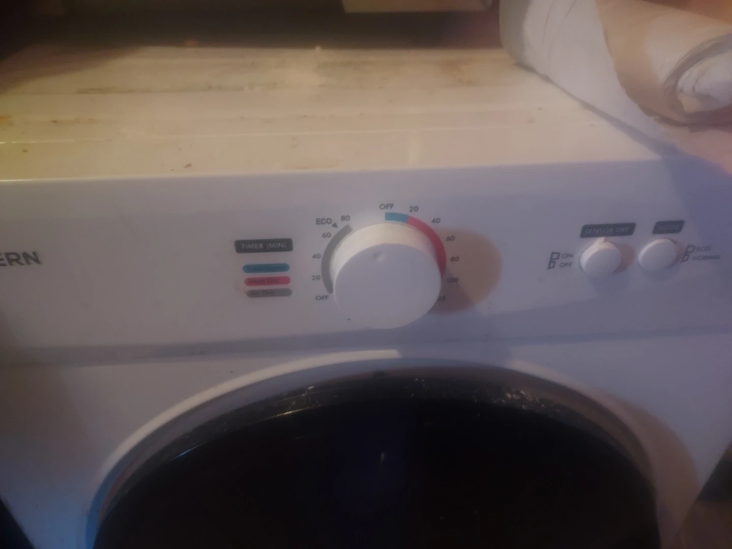 This is a Santern compact clothes dryer. It's white and has a control dial with timer and heat settings. It's a great option for small spaces!