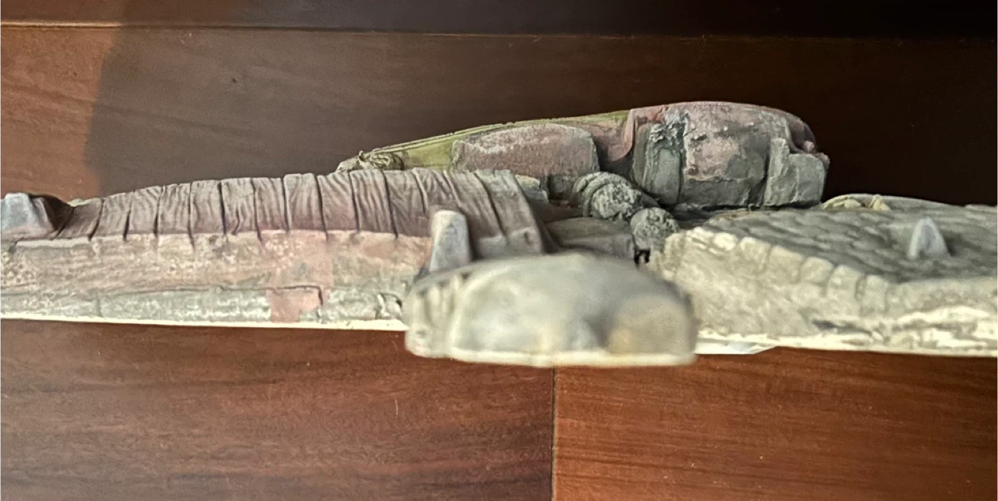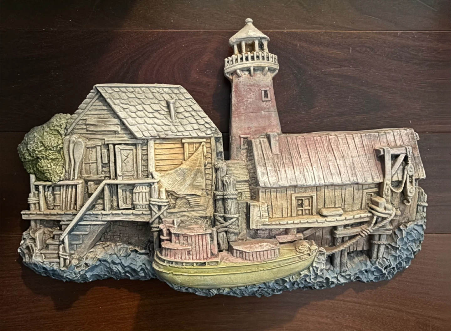 This is a detailed pottery wall hanging featuring a lighthouse, buildings, and a boat. It's a charming piece for adding a nautical touch to your decor.