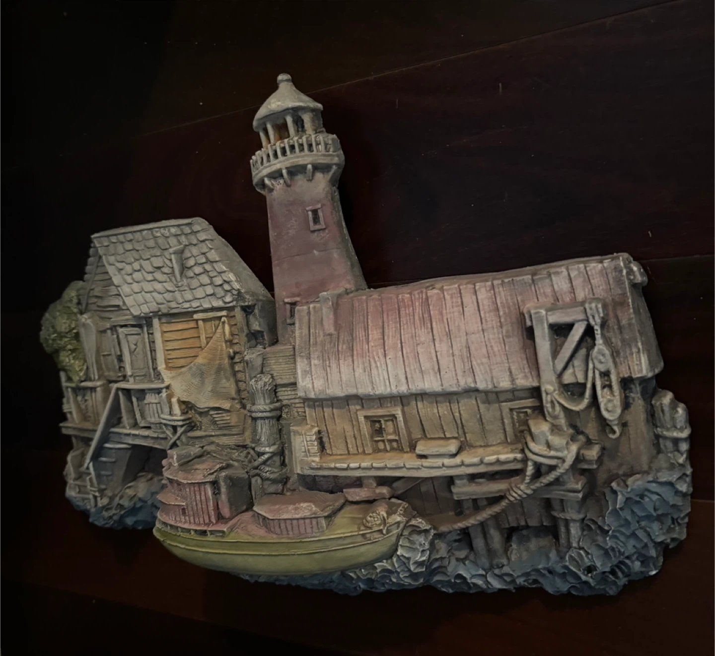 This is a detailed pottery wall hanging featuring a lighthouse, buildings, and a boat. It's a charming piece for adding a nautical touch to your decor.
