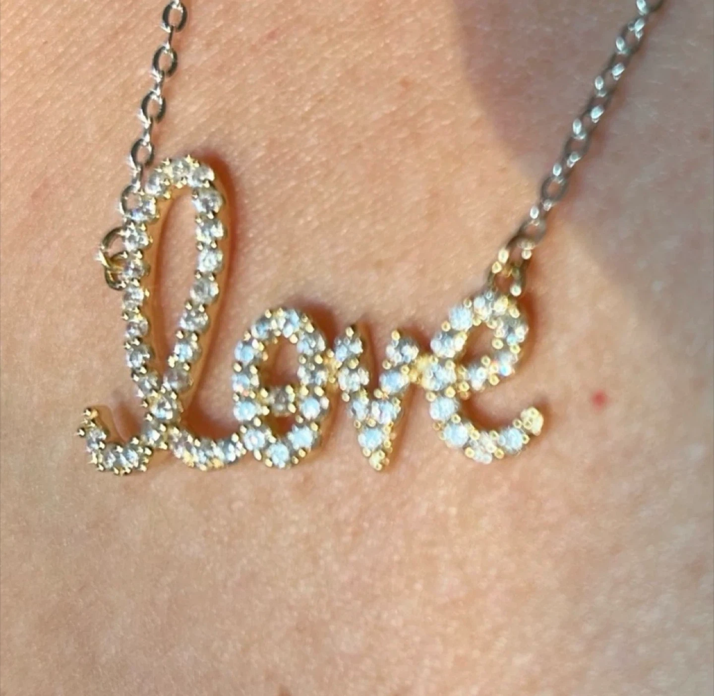 BRAND NEW/UNWORN. The word LOVE is a really hard to find larger size, it’s not tiny!!! The stones are CZ/cubic zirconia that are VERY BLINGY/GLITTERY and the chain is VERY BRIGHT SILVER, ULTRA SHINEY 925 sterling silver, and the pendant part is also made of sterling silver base metal but it plated and layered in 14k YELLOW GOLD plating. If you like mixing metals/colour, this is for you!! Its stunning!!