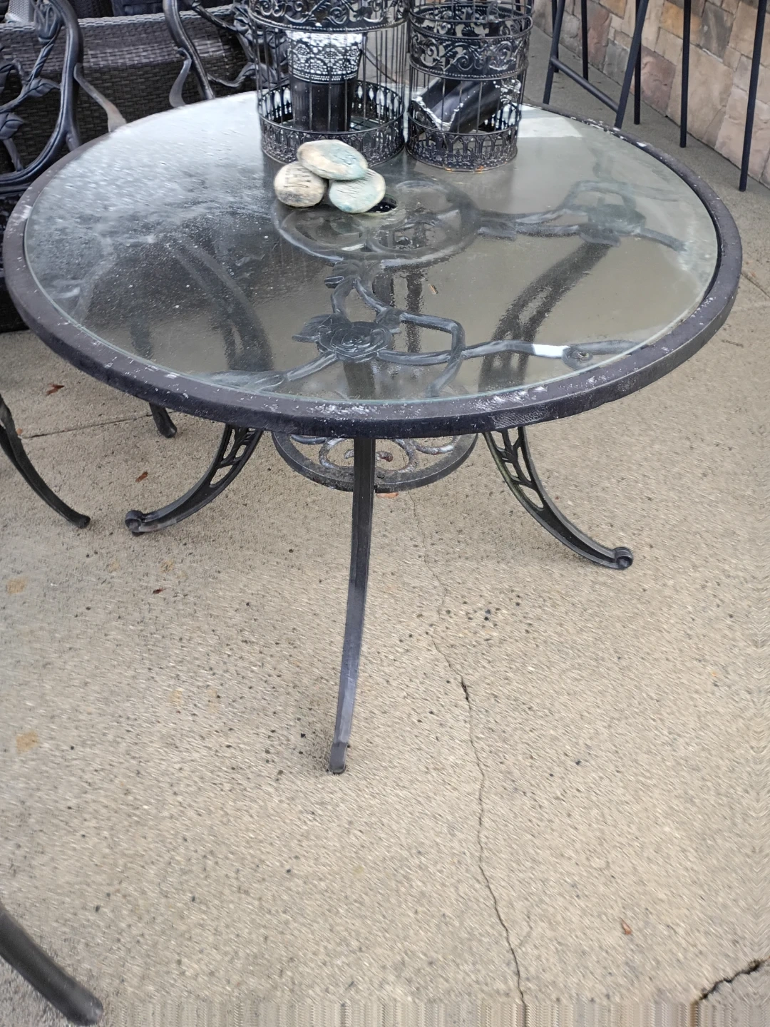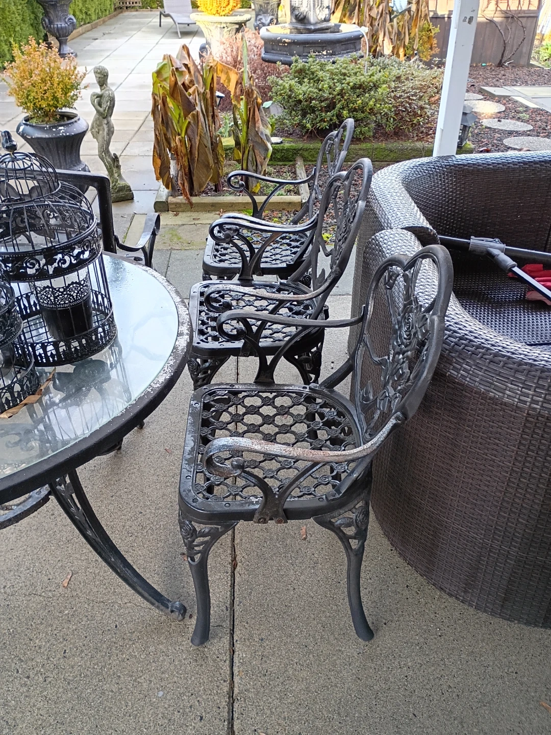 These classic black metal outdoor chairs feature a decorative design. The set includes a round glass-top table with a matching metal base. It's perfect for enjoying your backyard patio or garden space. The chairs are made of durable metal, and the table has a sturdy frame.