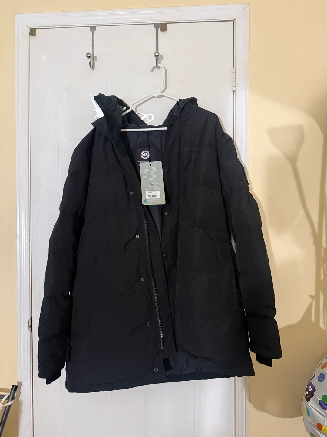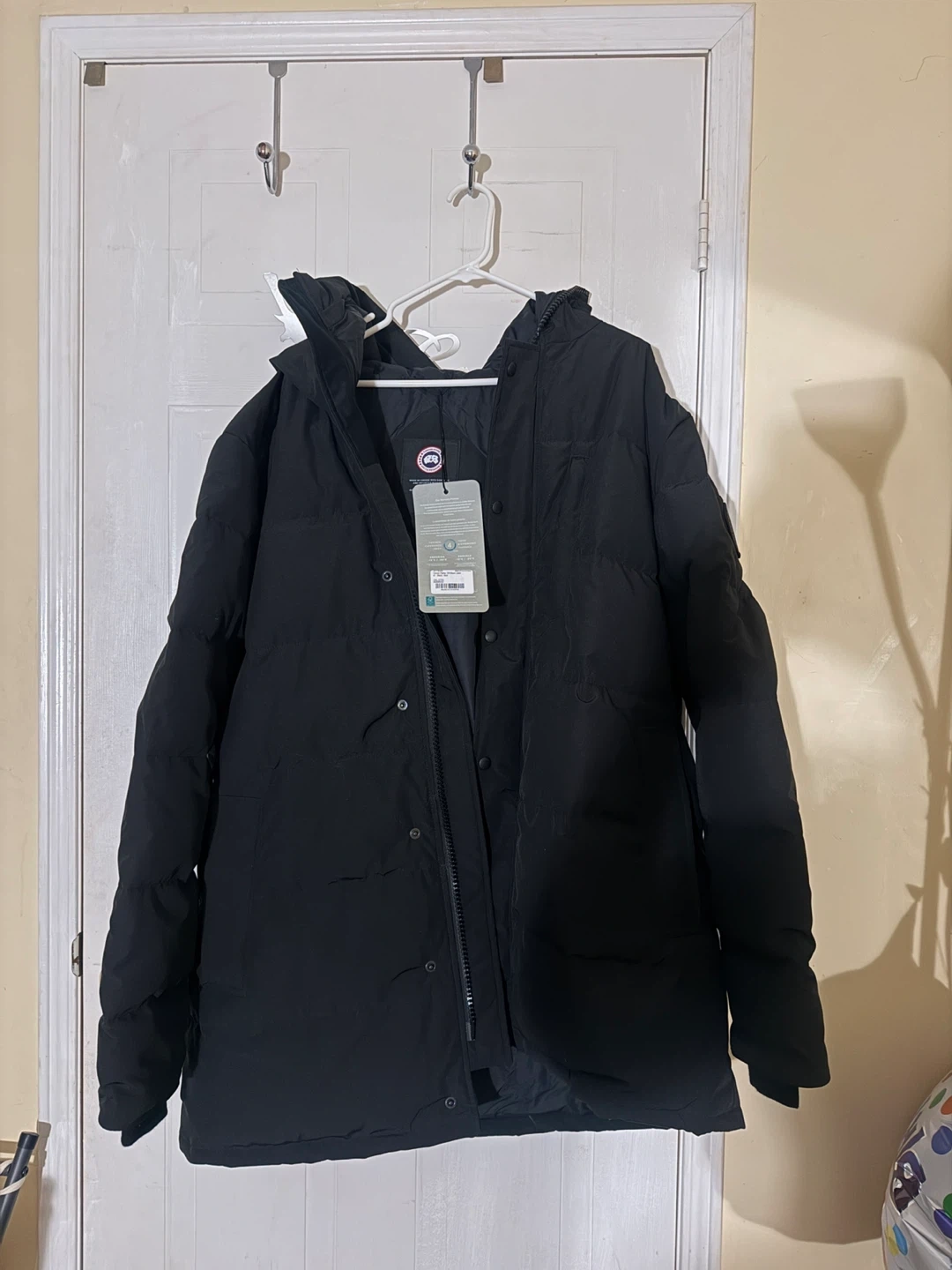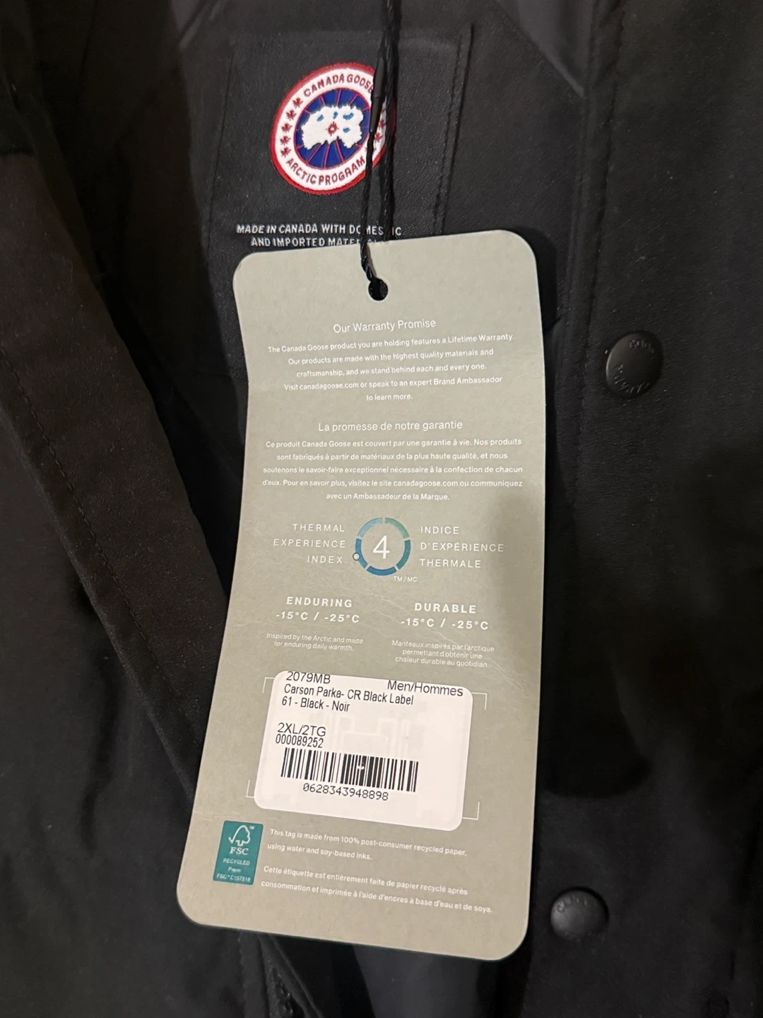 This is a brand new never worn Canada Goose Carson Parka in black. It's a men's jacket, size 2XL. It has a thermal experience index of 4, rated for -15°C to -25°C. It's made in Canada with down and imported materials.