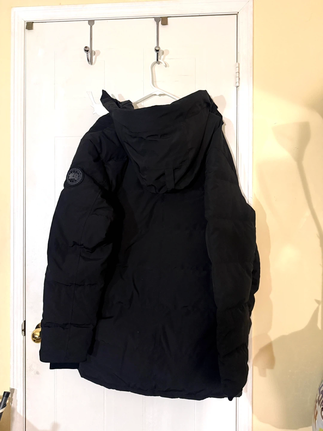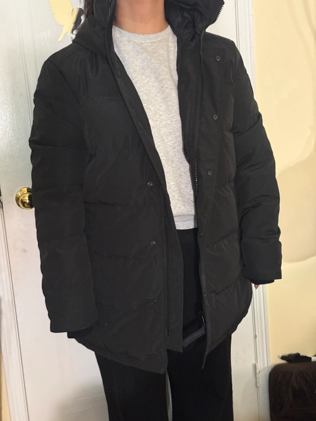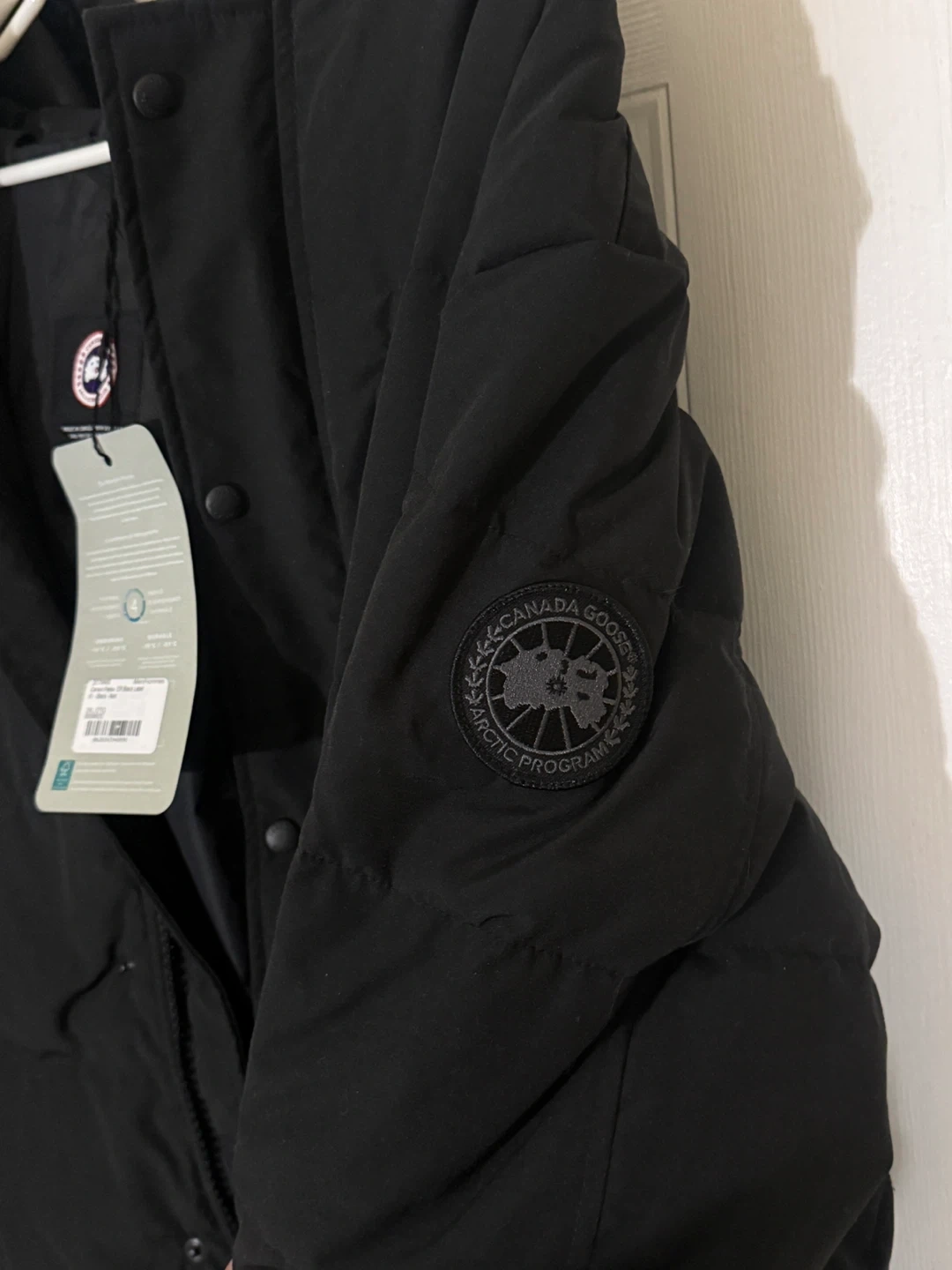 This is a brand new never worn Canada Goose Carson Parka in black. It's a men's jacket, size 2XL. It has a thermal experience index of 4, rated for -15°C to -25°C. It's made in Canada with down and imported materials.