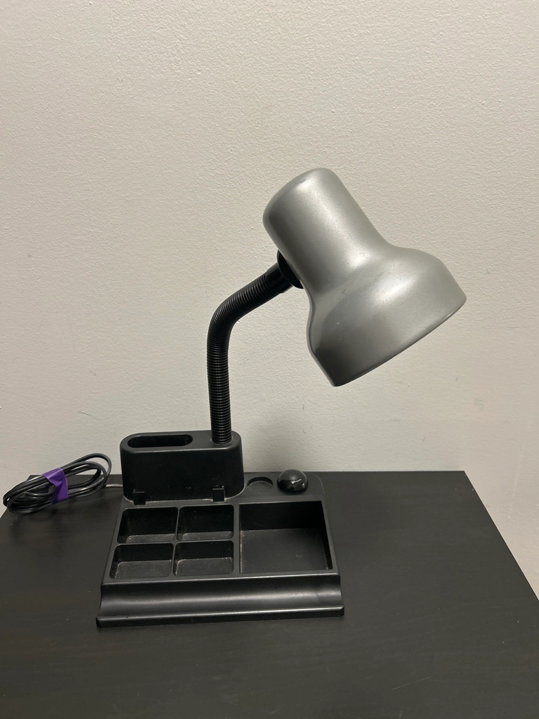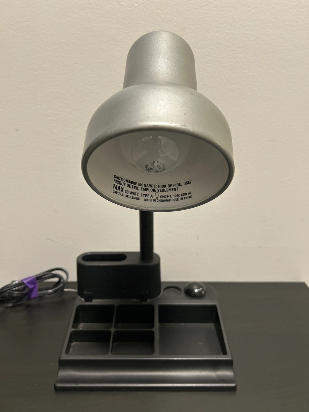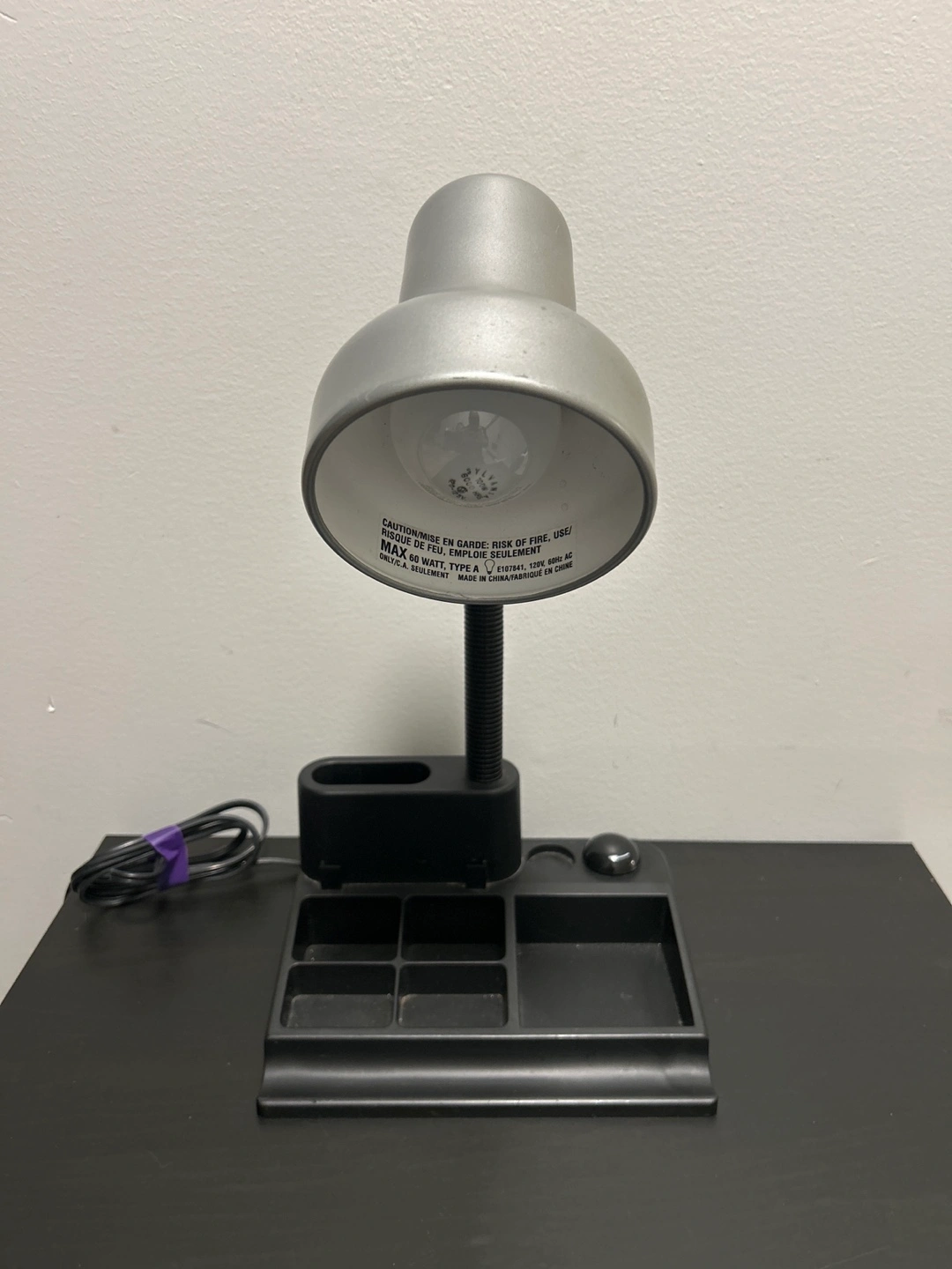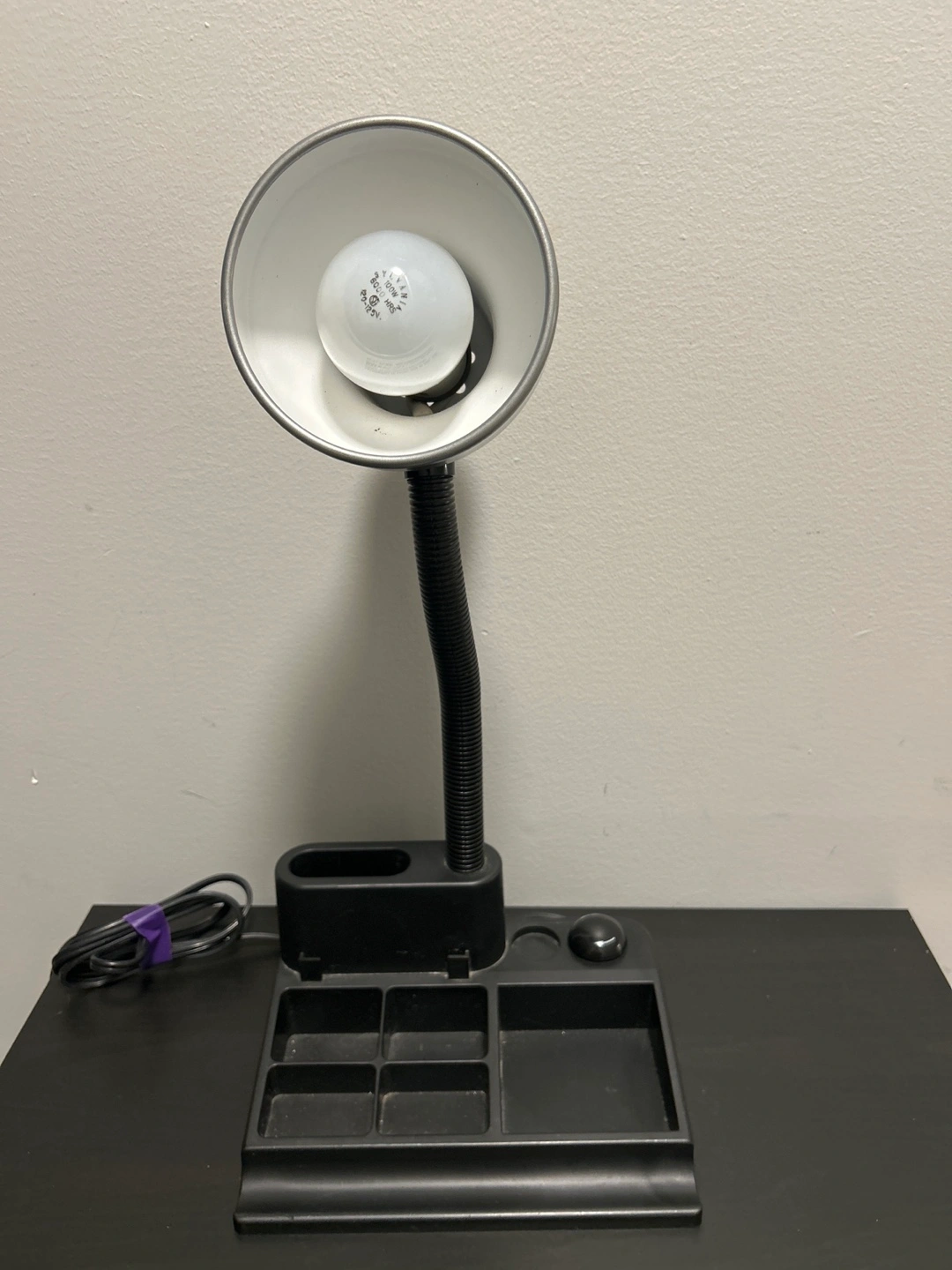 This is a black gooseneck desk lamp with an integrated organizer base. It has a flexible neck for adjustable lighting. Max 60 Watt type A bulb. Made in China.
