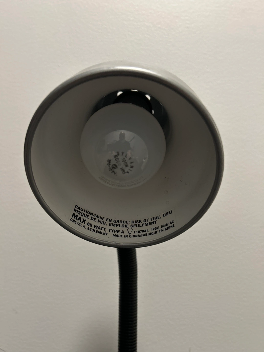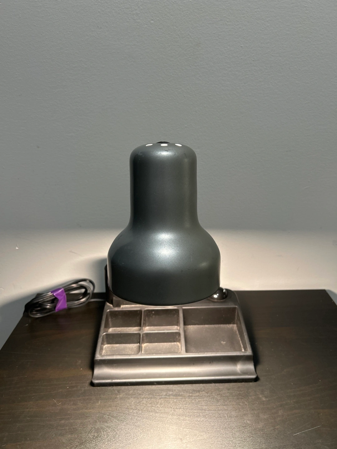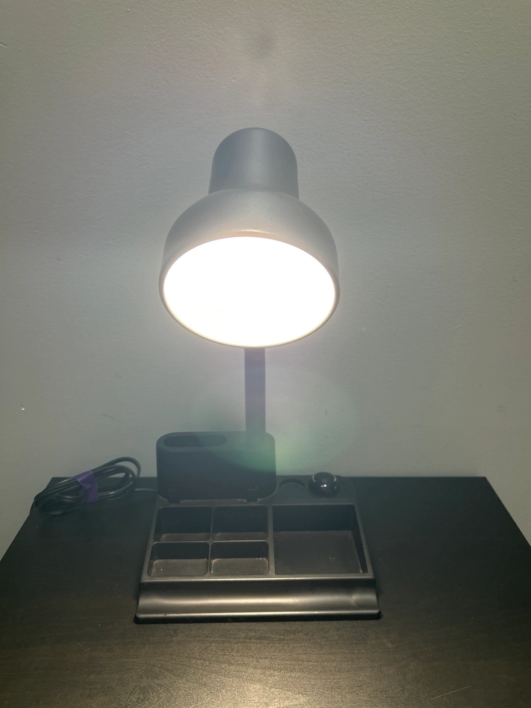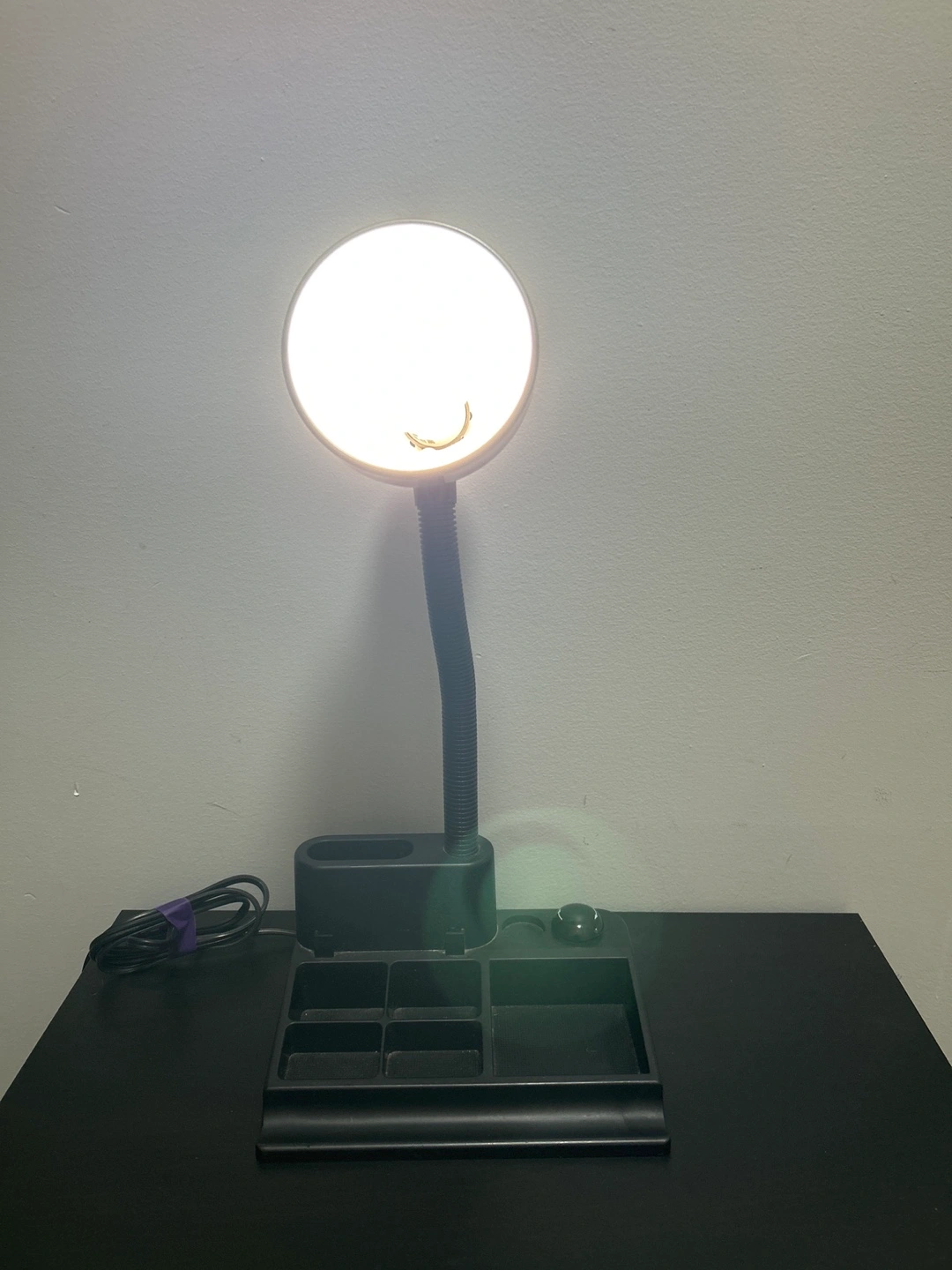 This is a black gooseneck desk lamp with an integrated organizer base. It has a flexible neck for adjustable lighting. Max 60 Watt type A bulb. Made in China.
