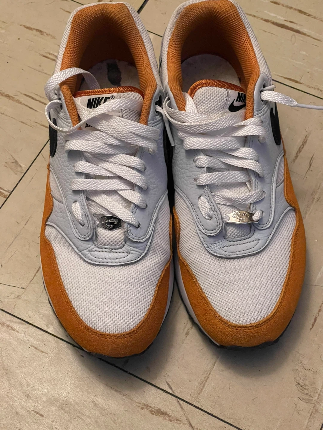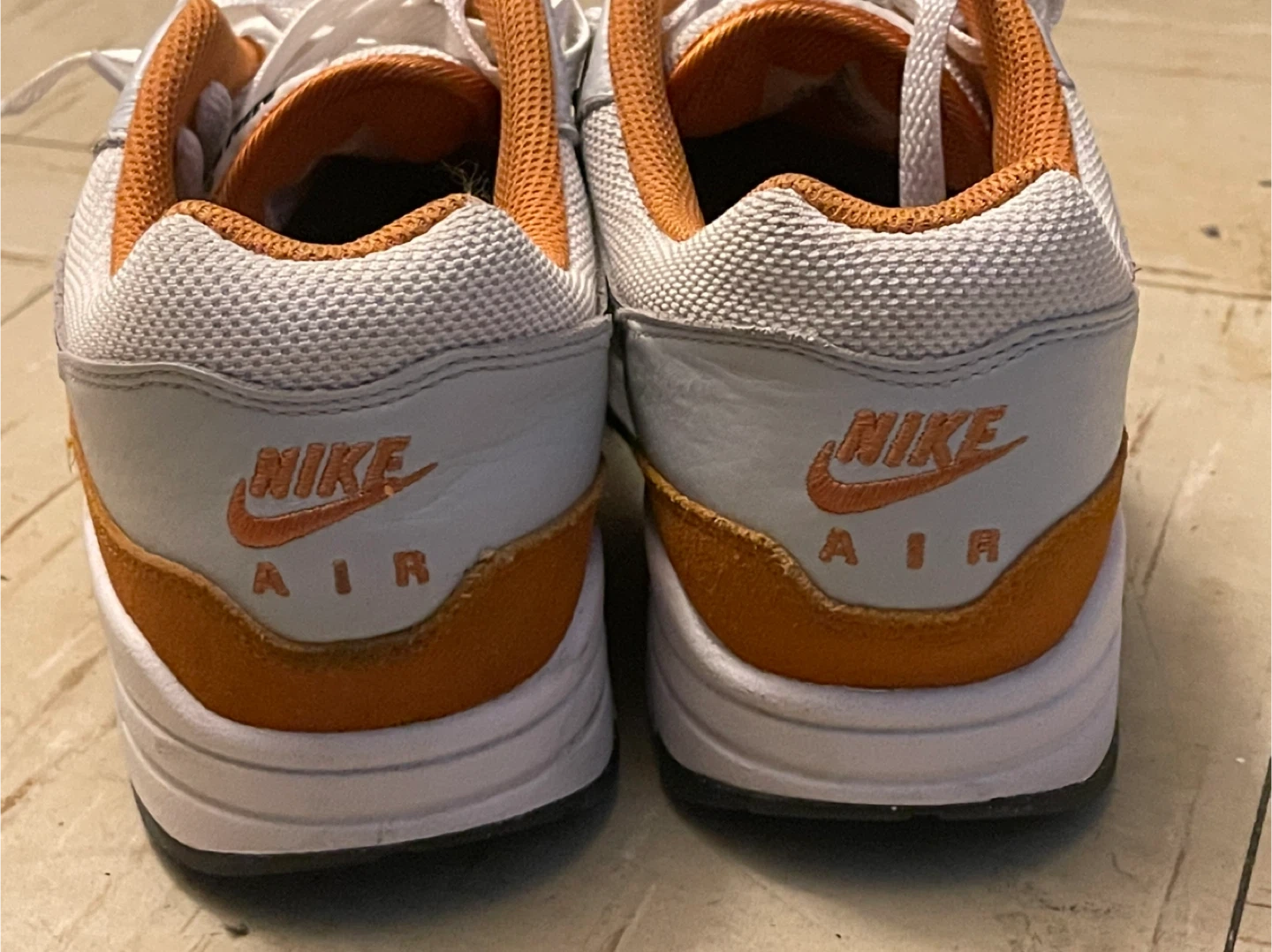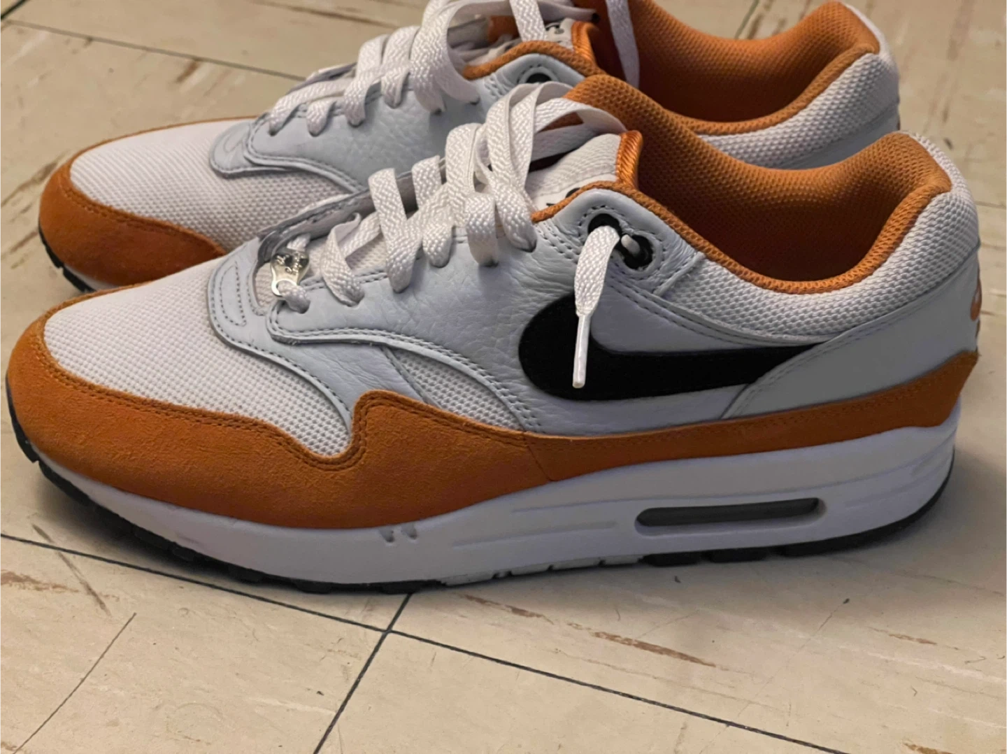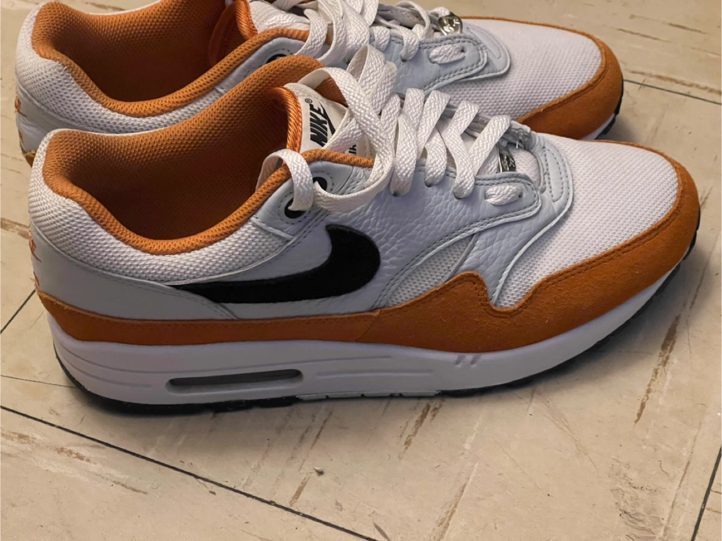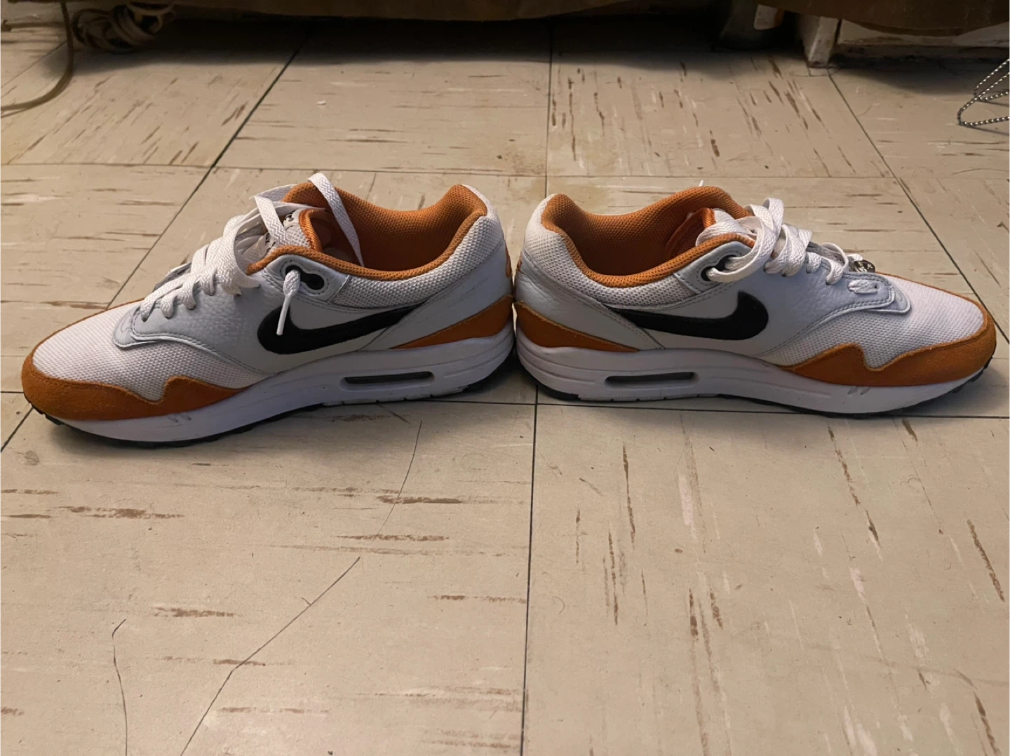 Selling a pair of Nike Air Max 1 sneakers in a white and orange colorway. These shoes are in great condition and ready for a new owner! The classic design and comfortable fit make them perfect for everyday wear.