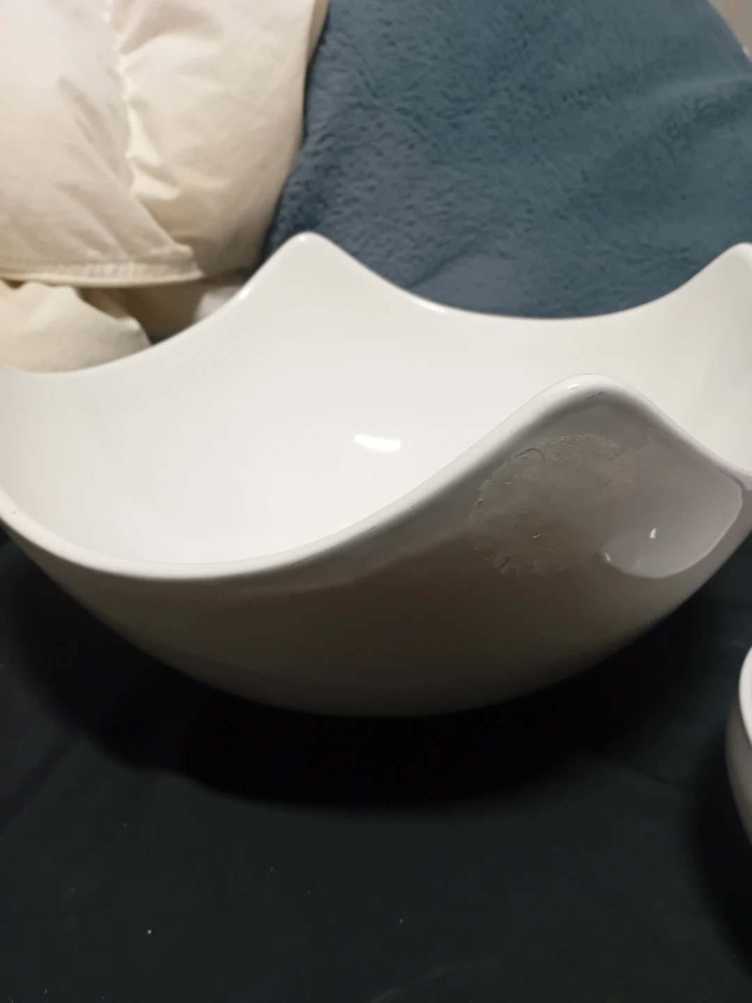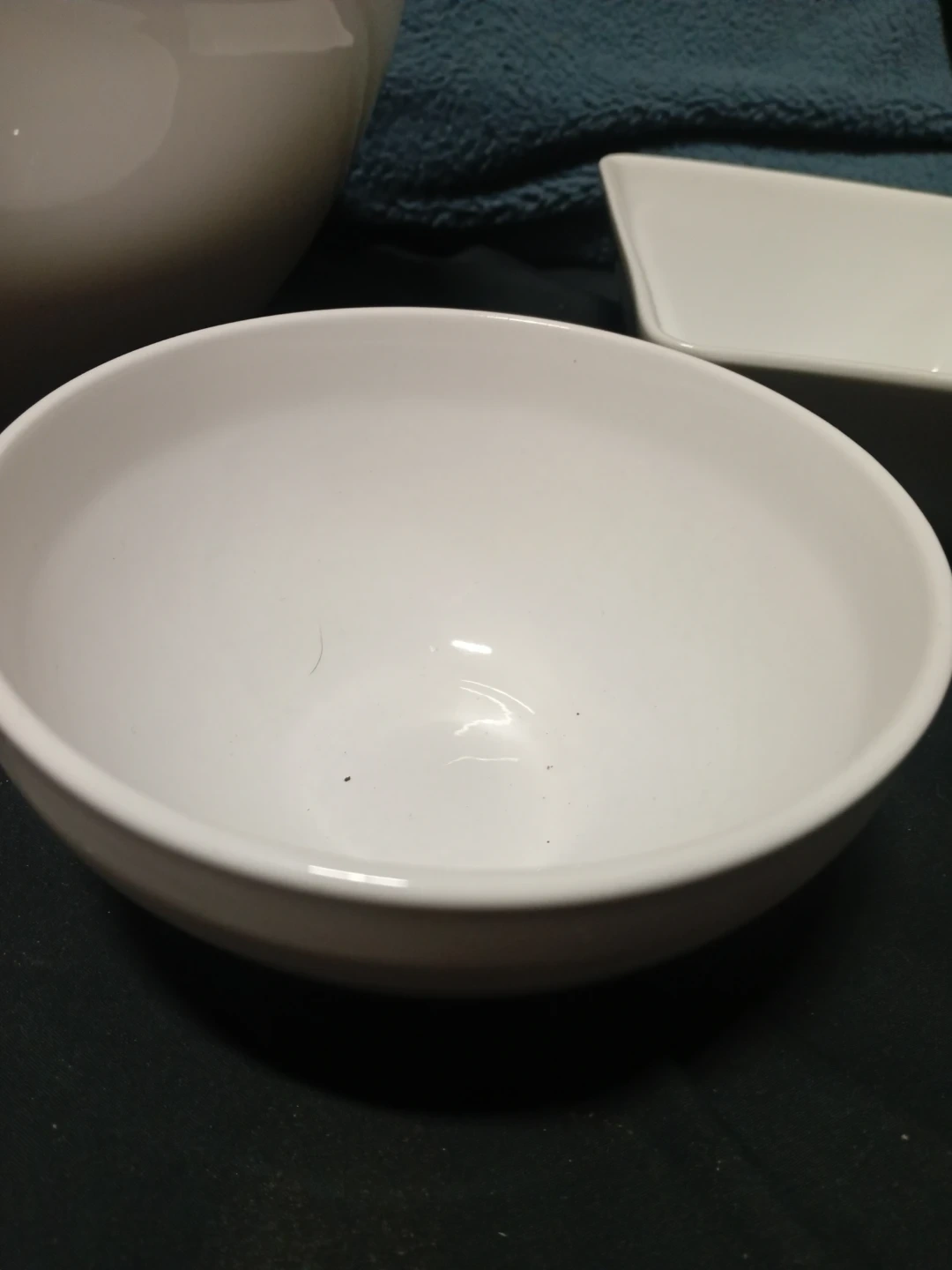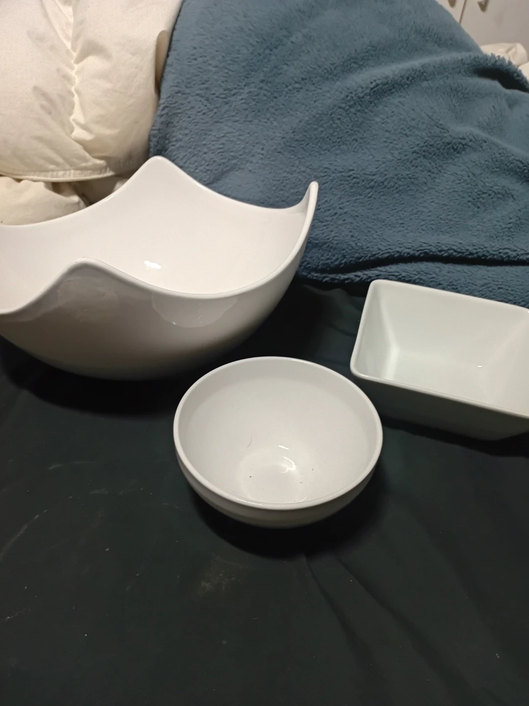 For all 3 new This set includes one large wavy bowl, one medium round bowl, and one small square bowl. They're all made of white ceramic. Perfect for serving snacks or salads!