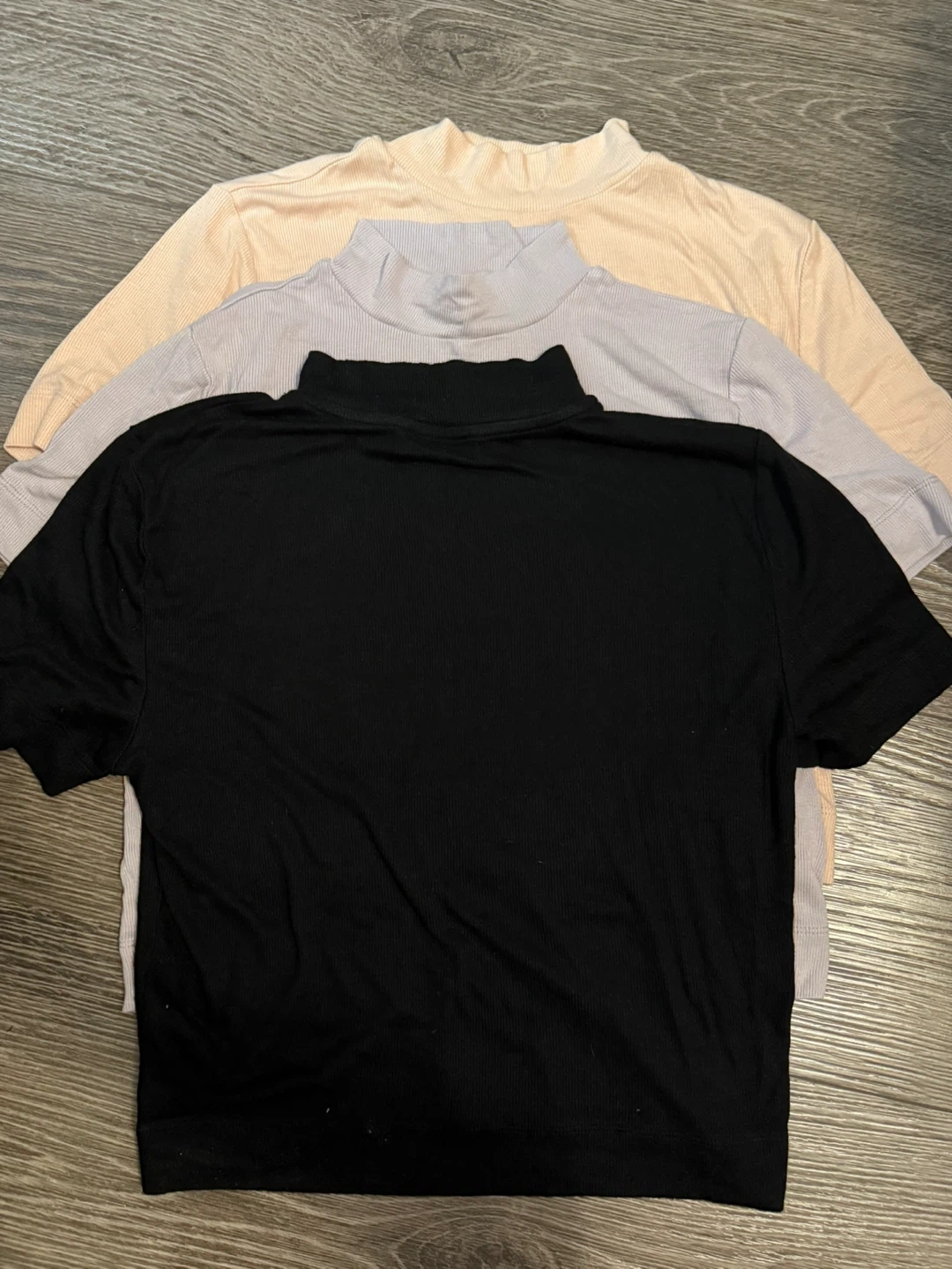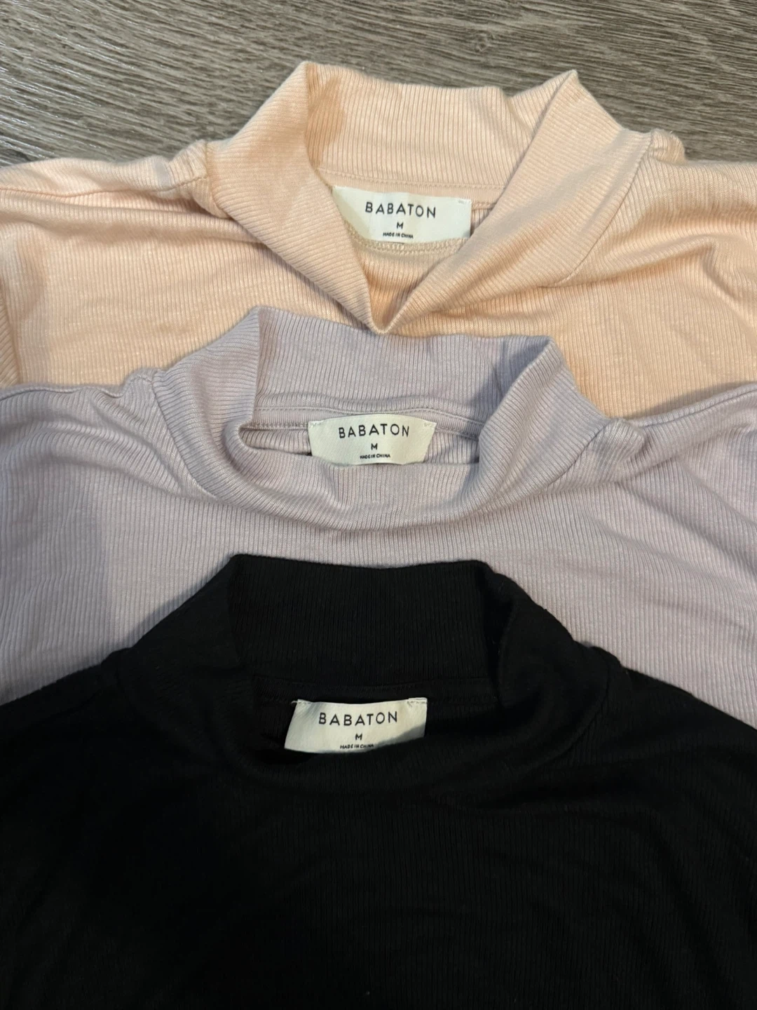 Three Babaton mock neck tops in black, light purple, and pale peach. All are size medium and made of a ribbed fabric. These tops are perfect for layering or wearing on their own! Worn about twice but realize they don’t look good on me :(. Selling for $40 each. Aritzia no longer sells these