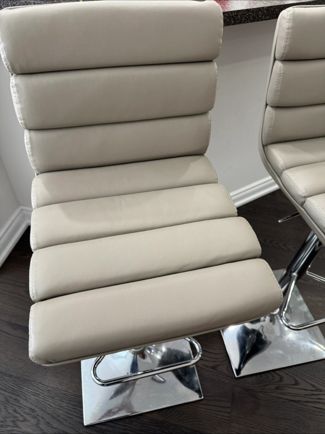 Two contemporary bar stools. Neutral grey/beige cushioned seats. Chrome-coloured metal base. Adjustable height. Modern design. Excellent for kitchen island or bar. Buy two for $50. It’s a steal. Cash Pick up