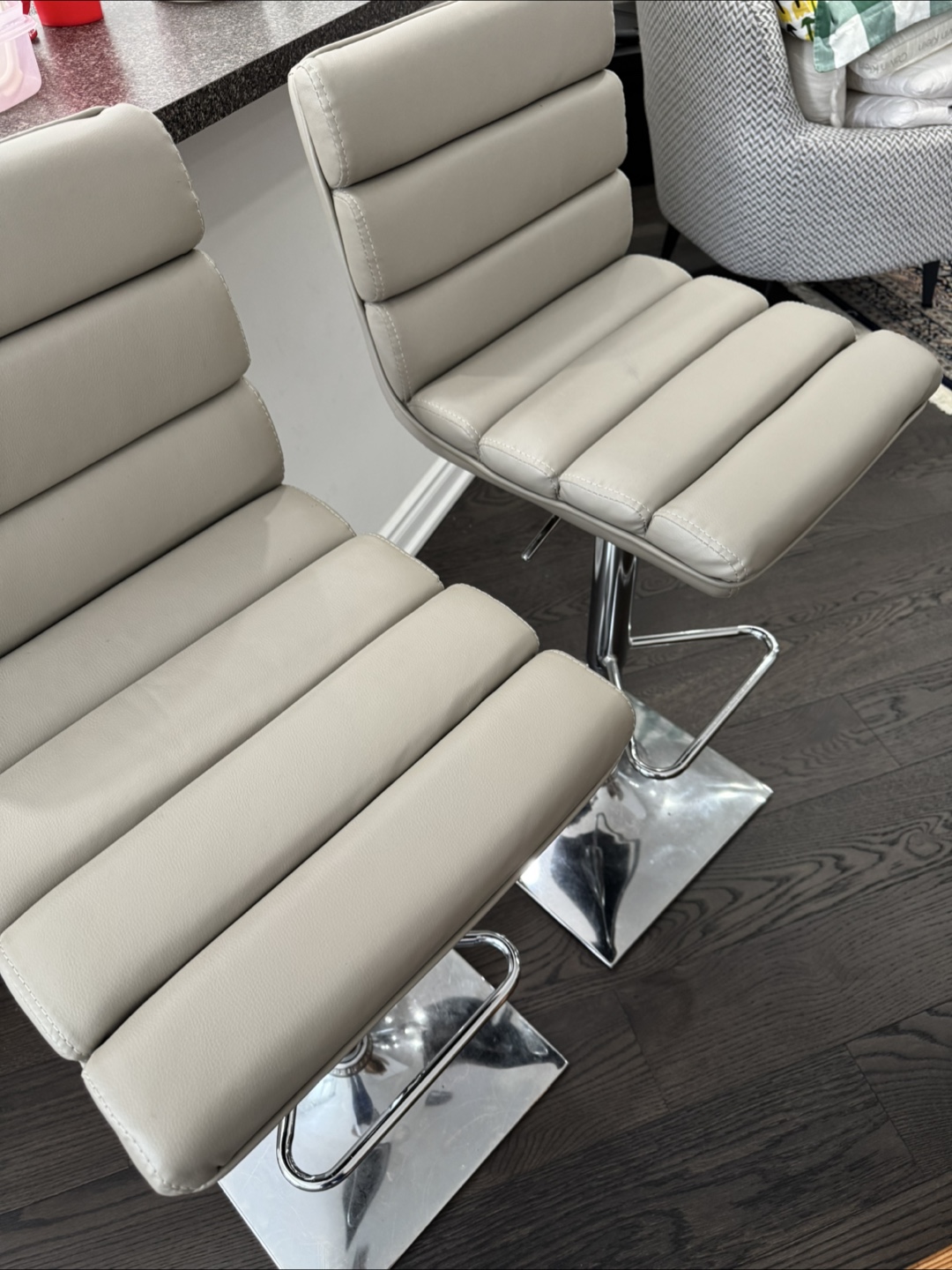 Two contemporary bar stools. Neutral grey/beige cushioned seats. Chrome-coloured metal base. Adjustable height. Modern design. Excellent for kitchen island or bar. Buy two for $50. It’s a steal. Cash Pick up