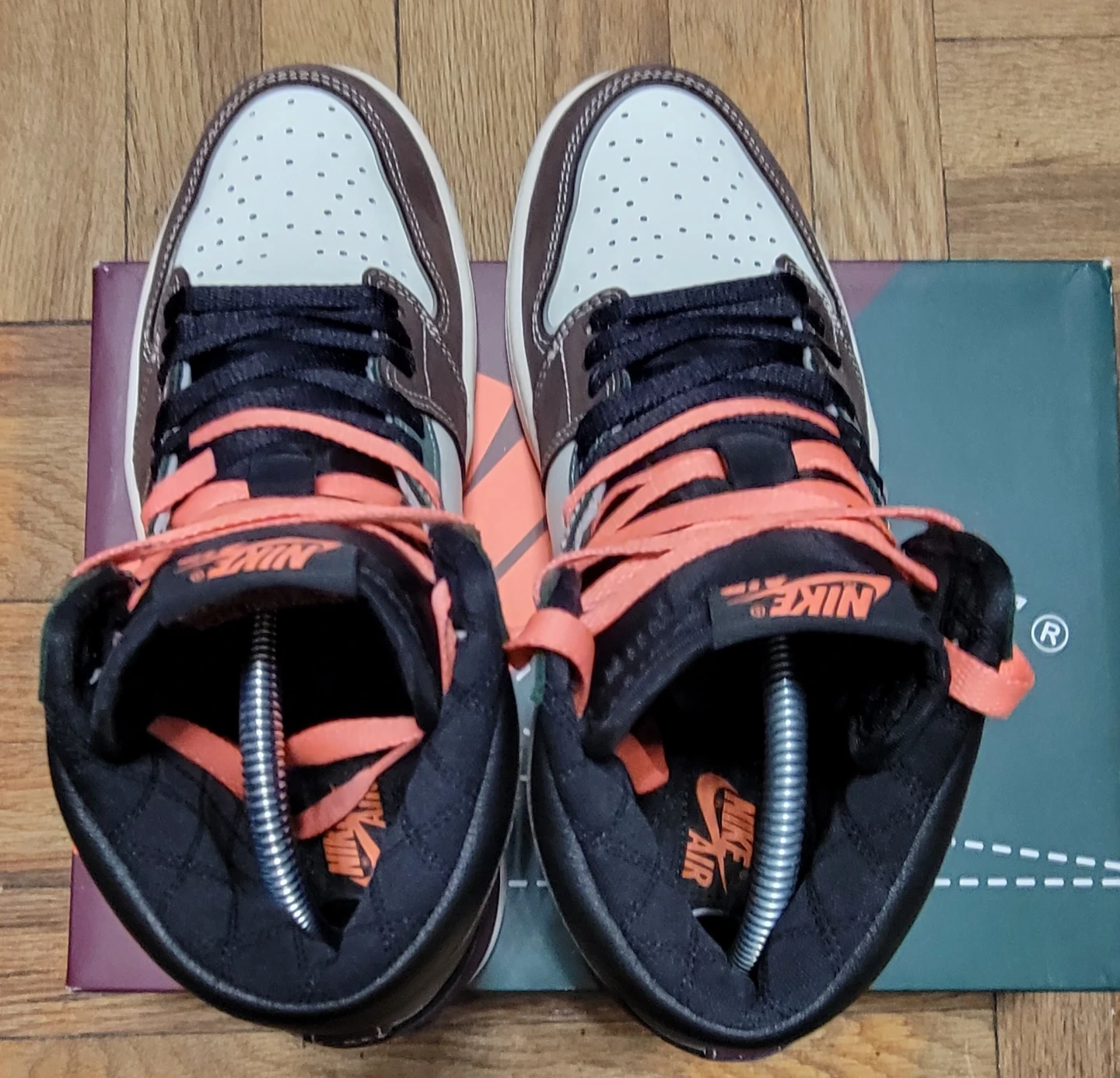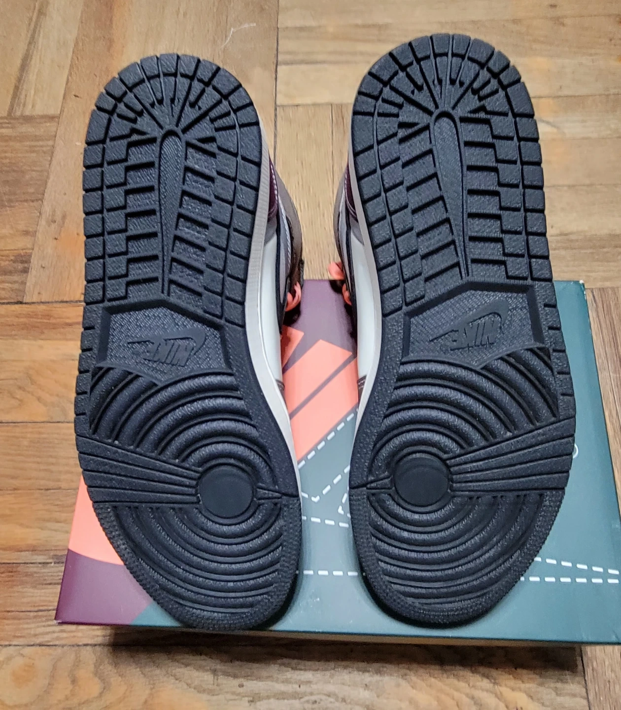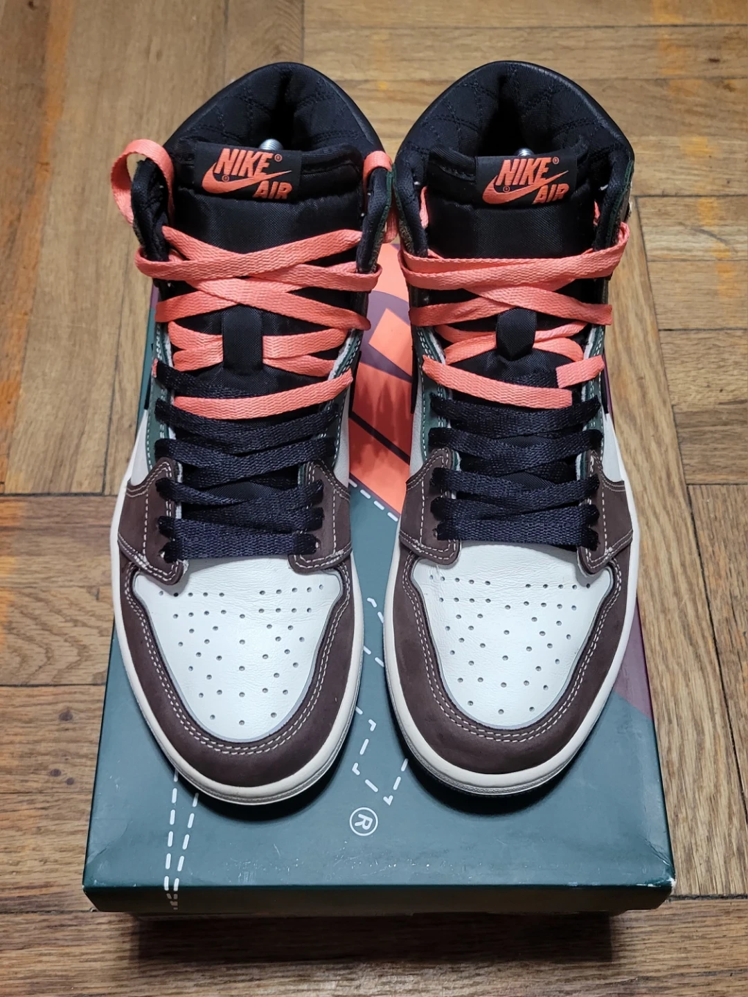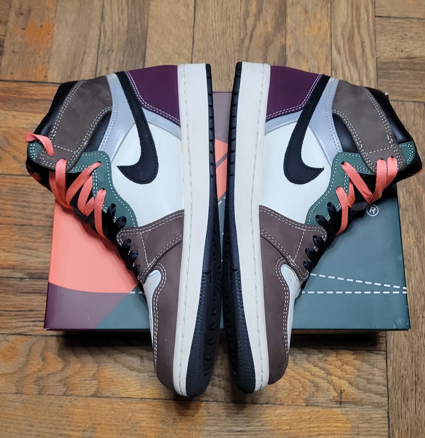These are the Air Jordan 1 High OG Palomino sneakers. They feature a mix of leather and suede in brown, white, black, and teal colorways. Comes with original box. A classic silhouette for any sneaker collection!