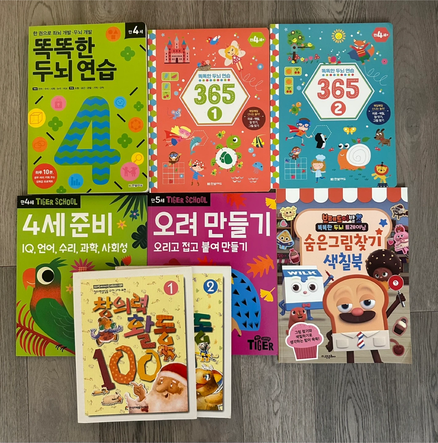 미사용 학습지 판매합니다! 4세용: 1) 똑똑한 두뇌연습 만4세 (한빛애듀) $12.00 2) 똑똑한 두뇌연습 365 1 (한빛애듀) $10.00 3) 똑똑한 두뇌연습 365 2 (한빛애듀) $10.00 4) 4세 준비 IQ, 언어, 수리, 과학, 사회성 (Tiger School) $7.00 (4세용 전체 구매시: $35.00) 5세용: 5) 오려 만들기 (타이거 스쿨) $6.00 6) 창의력 활동 100 (프뢰벨) 1+2권 $5.00 (창으력 활동 1권 7페이지는 사용했습니다) 7) 브레드이발소 숨은 그림찾기 색칠북 (고은문화사) $10.00 (전체 구매시: $50) Pick up: Yonge and Finch