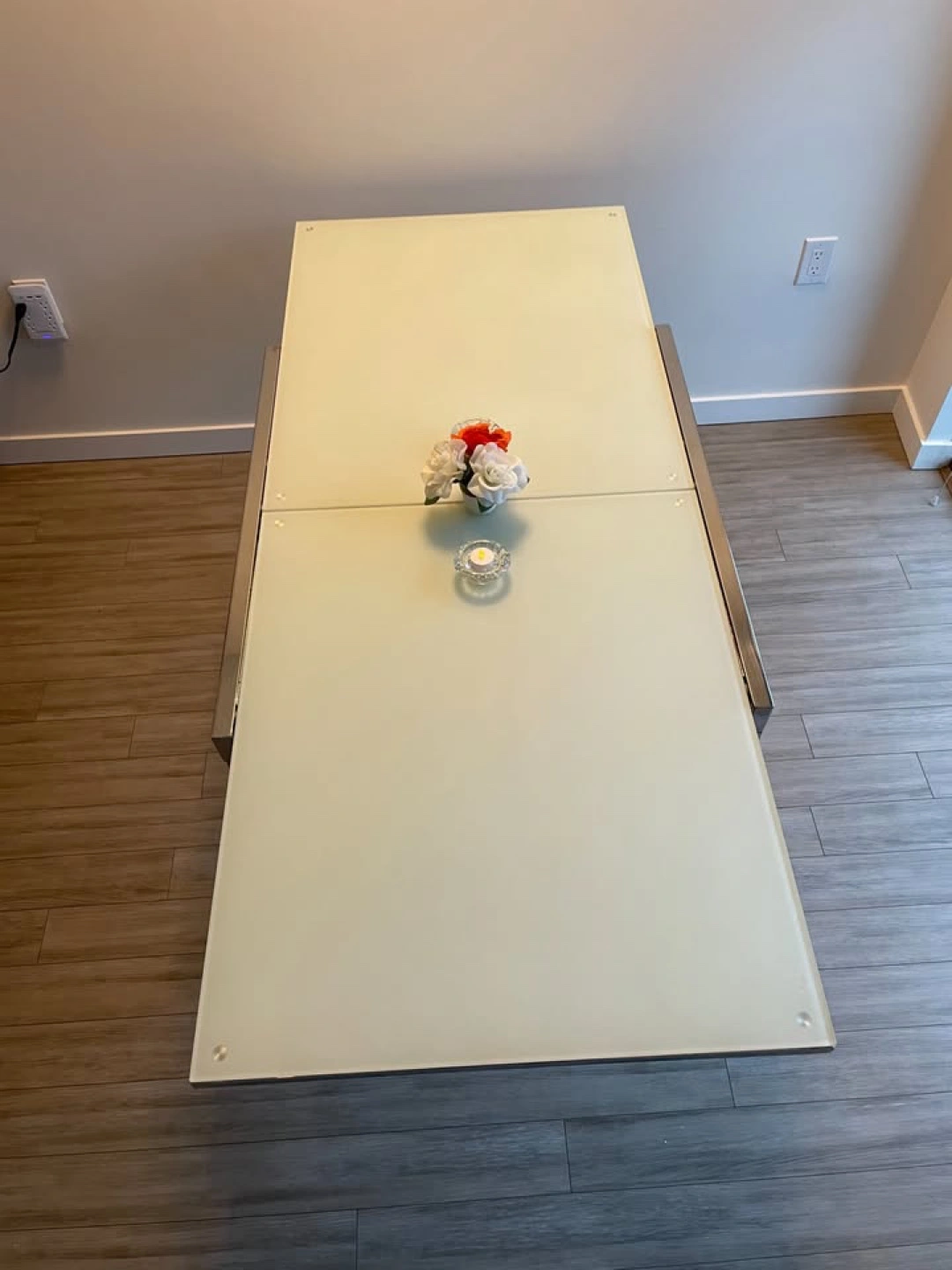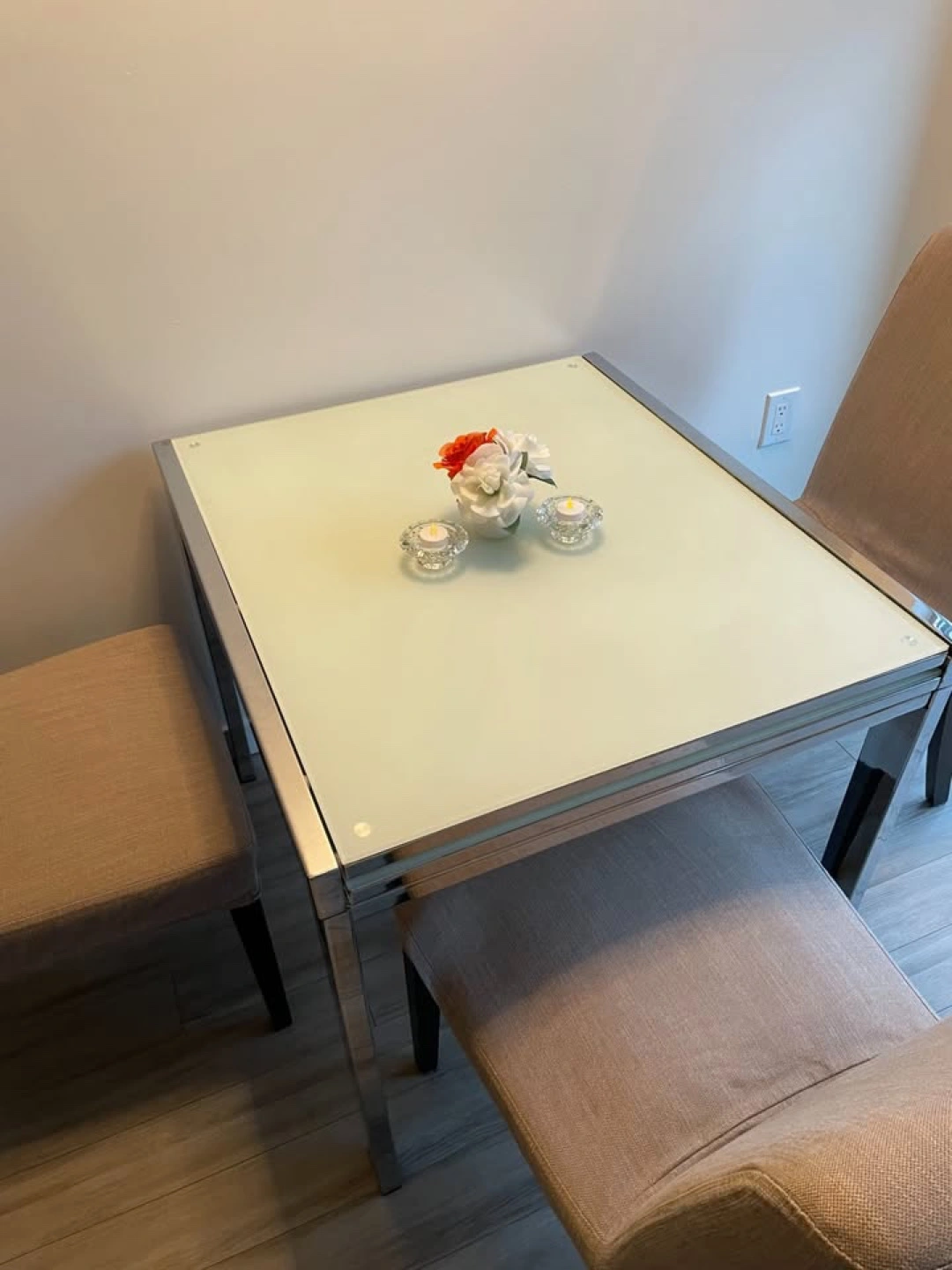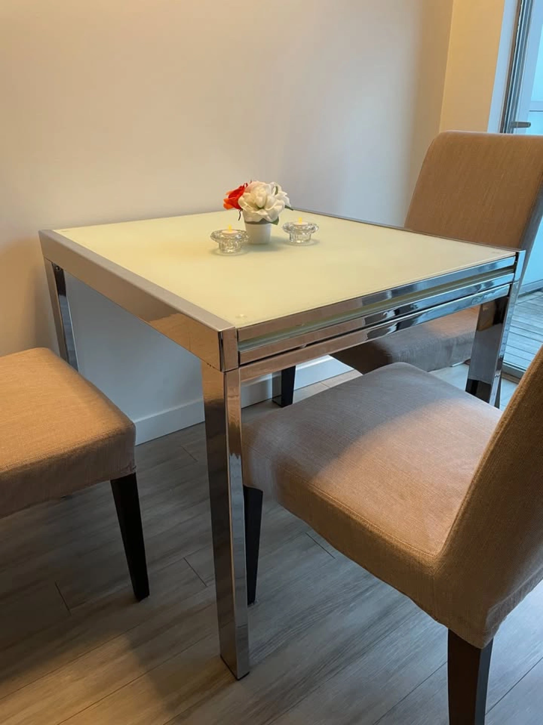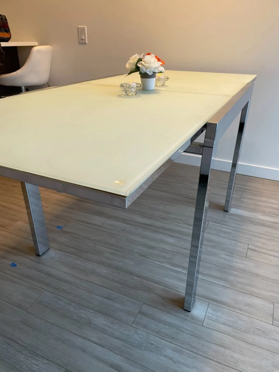 Frosted Glass and Silver Chrome Extendable Dining Table Top is frosted glass and sides and legs are shiny chrome. Great for apartments - when it is closed, it fits up to 4 people and when extended can fit 6-8. Dimensions Closed - 90cm x 80cm (including metal sides) Extended - 180cm x 74cm (80cm if including the metal sides) Height - 75.5cm Easy to open and close and glass is easy to wipe down and keep clean. Pick up in Burnaby Heights area. May deliver for additional fee. Message with location to inquire.