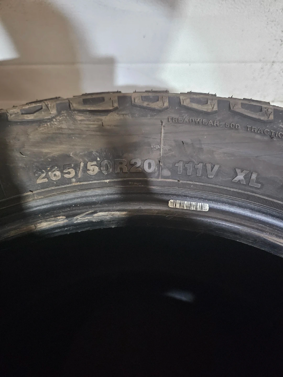 10Selling a set of Alpinism A/T tires. They are size 265/50R20 111V XL. These tires have a treadwear rating of 500.