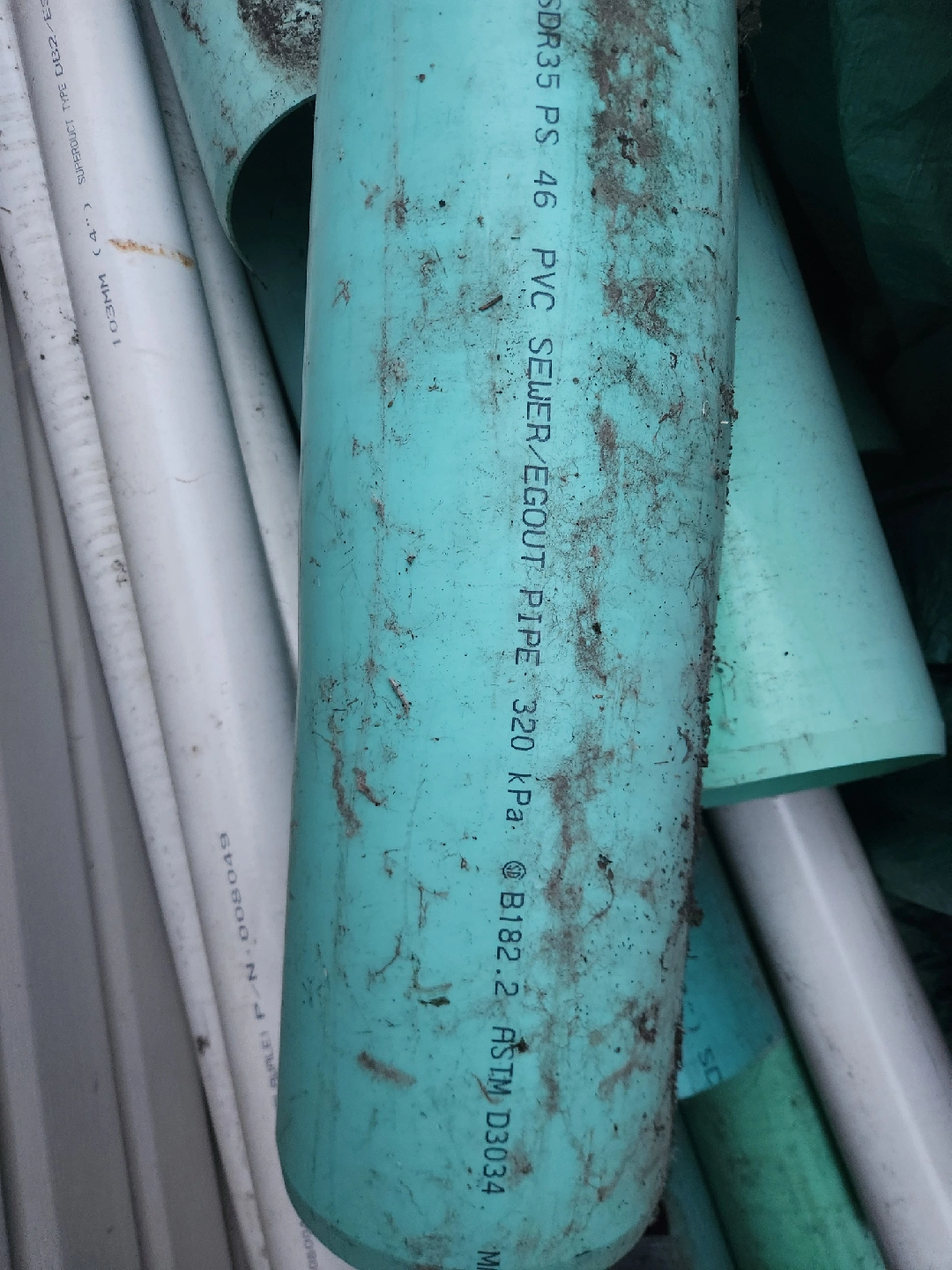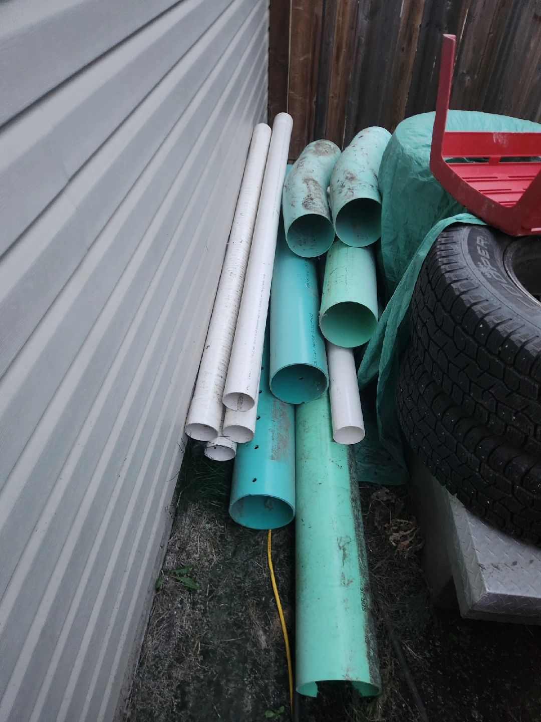 65Various PVC pipes in different sizes and conditions. 5 partial sticks a out 5' long of 4" PVC. $10 each. 2 pieces of 8" SDR35 perforated drain pipe. $10 per foot. 2 pieces of 8" SDR35 solid pipe. $10 per foot. 2 pieces of 8" SDR35 22.5 degree angle long sweep bends. $100 each. Better price if you take multiple items. PVC and SDR35 are perfect for French drains, driveway culverts, dust collection systems, plumbing and more.