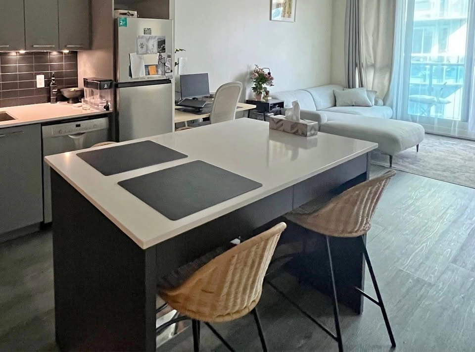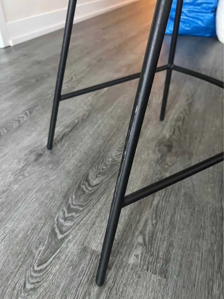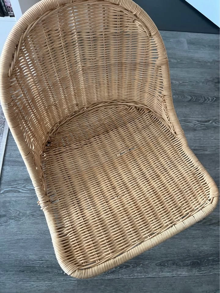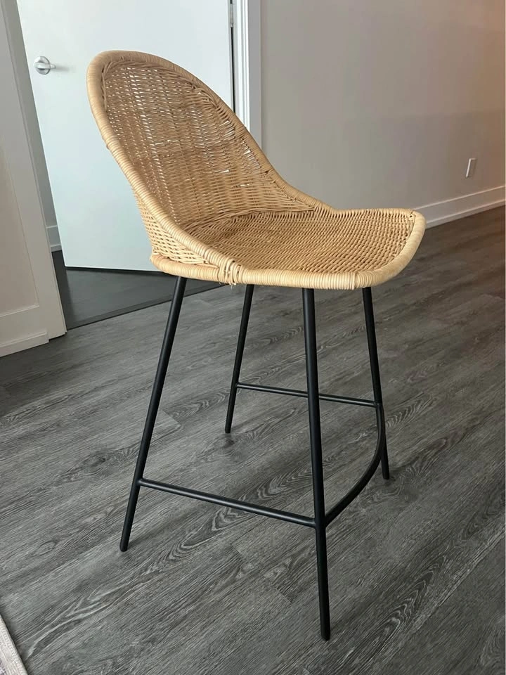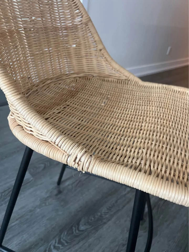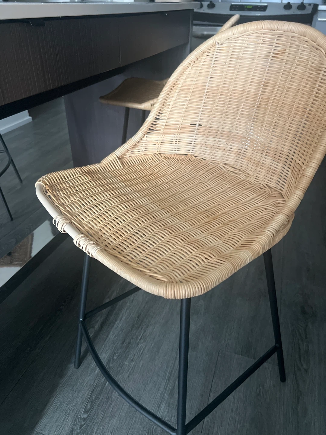 Stylish rattan bar stools with black metal legs. Comfortable curved back, great for kitchen island or bar seating. Condition: Used, good. Legs have a few color scrapes, and rattan has minor peeling in a couple of spots (see photos), but overall sturdy and functional. Price: $250 for all four Pickup only. Richmond Hill