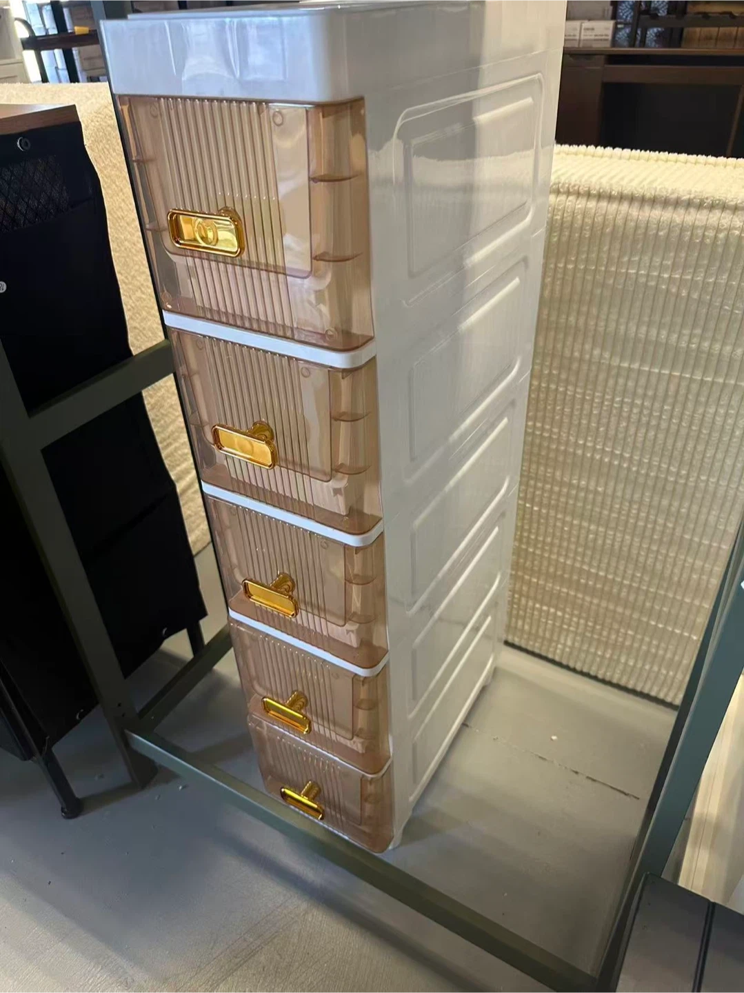 70Here's a handy 4-drawer plastic storage tower! It's perfect for organizing small items in your closet, office, or any room where you need a bit of extra storage. The drawers are a nice translucent colour, and the gold-coloured handles add a touch of style
