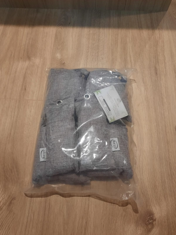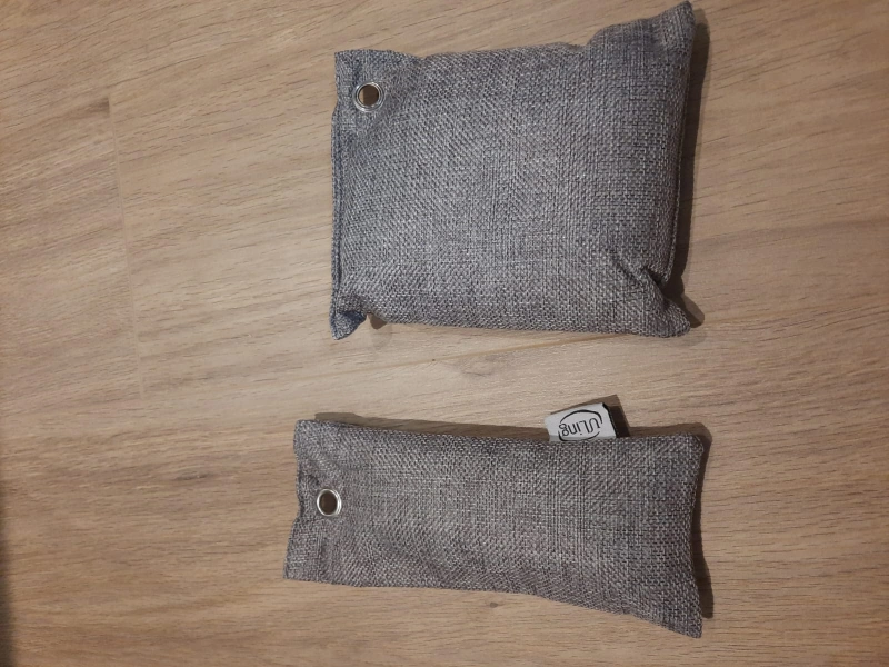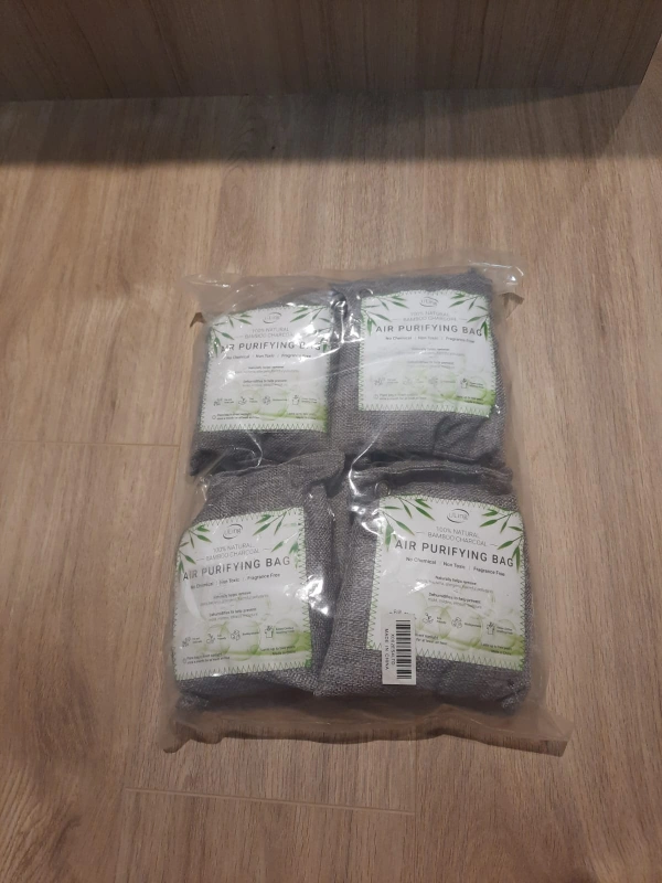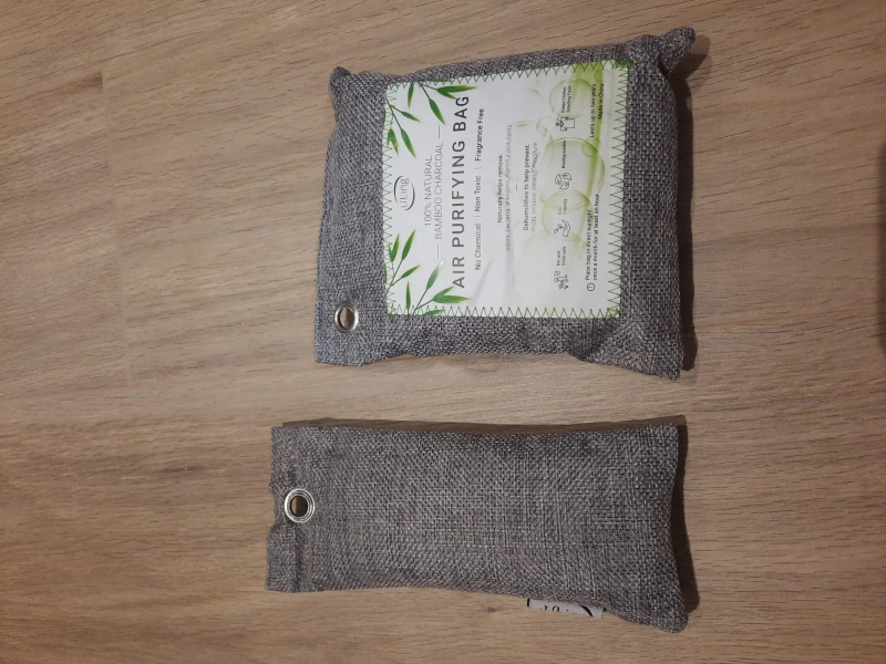 10Set of four grey air purifying bags. Bamboo charcoal. Absorbs odours and moisture. Great for closets, cars, or bathrooms.