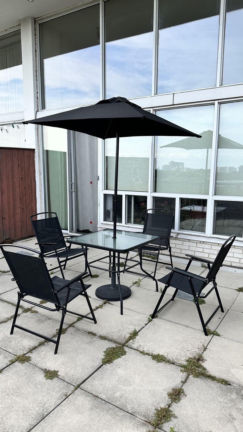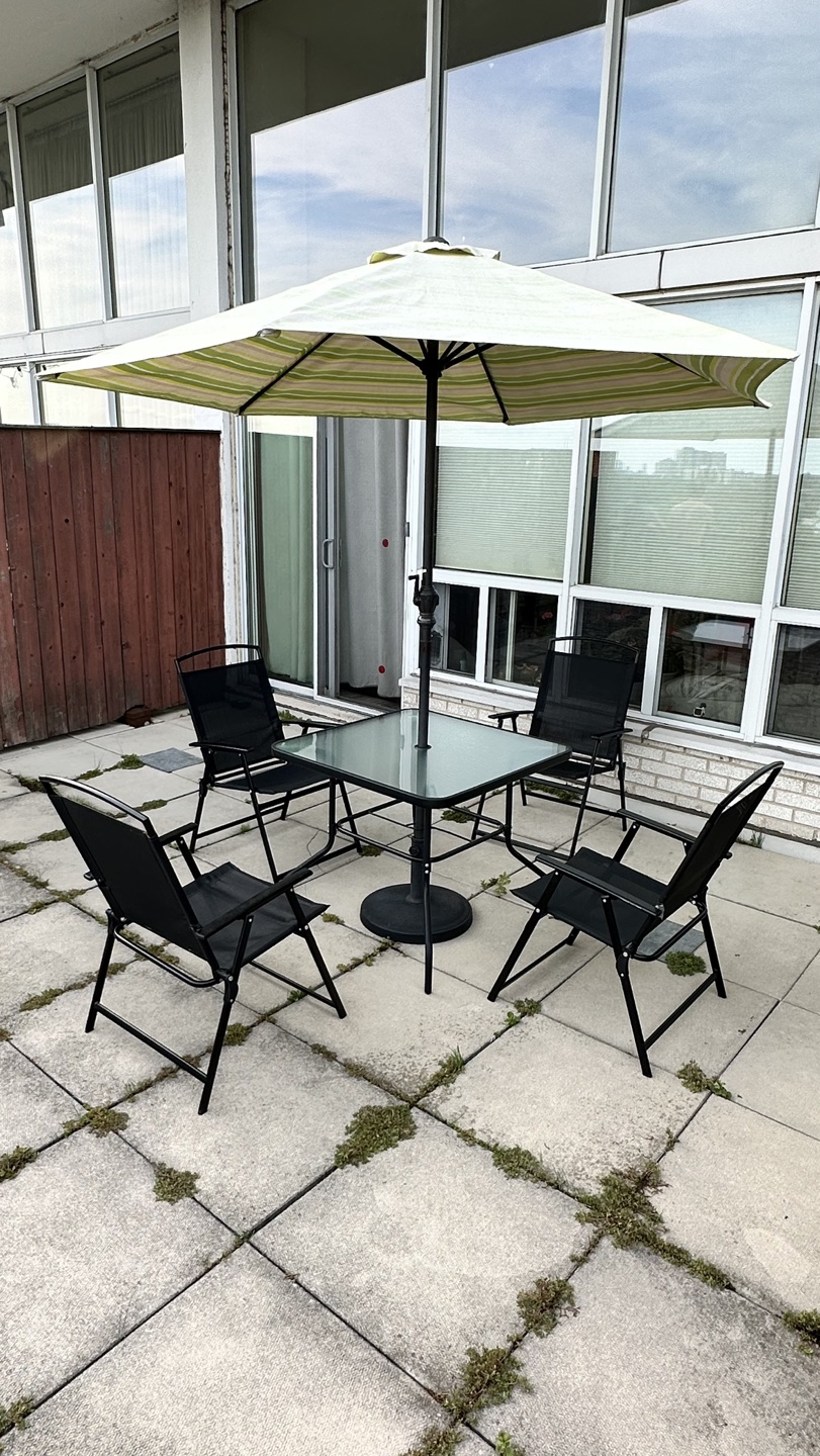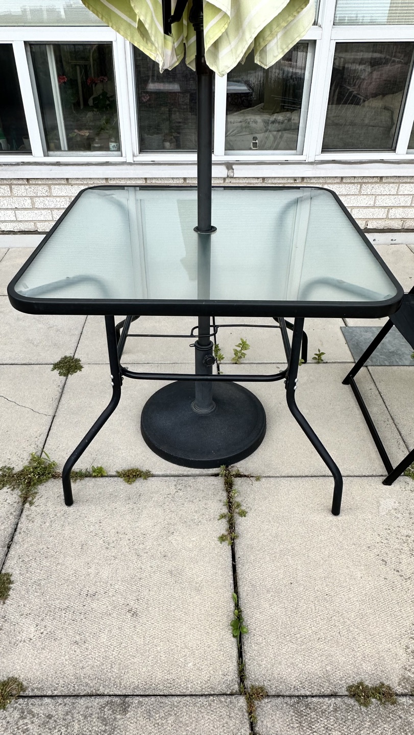 This outdoor dining set includes 4 folding chairs, a shatter-resistant glass tabletop, and a UV-resistant umbrella. You can have the green umbrella for free if you purchase the whole set. Pickup only:)