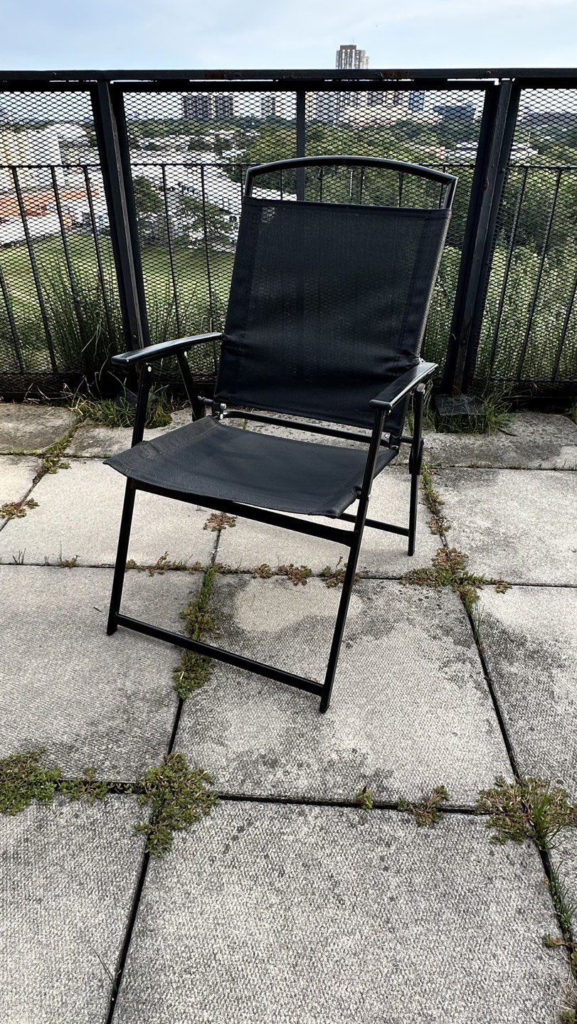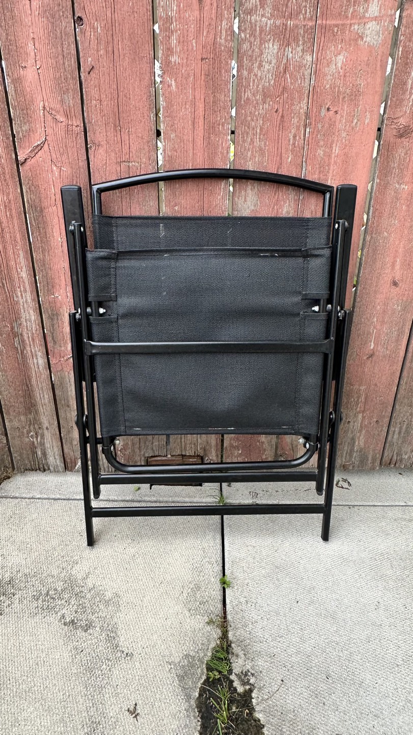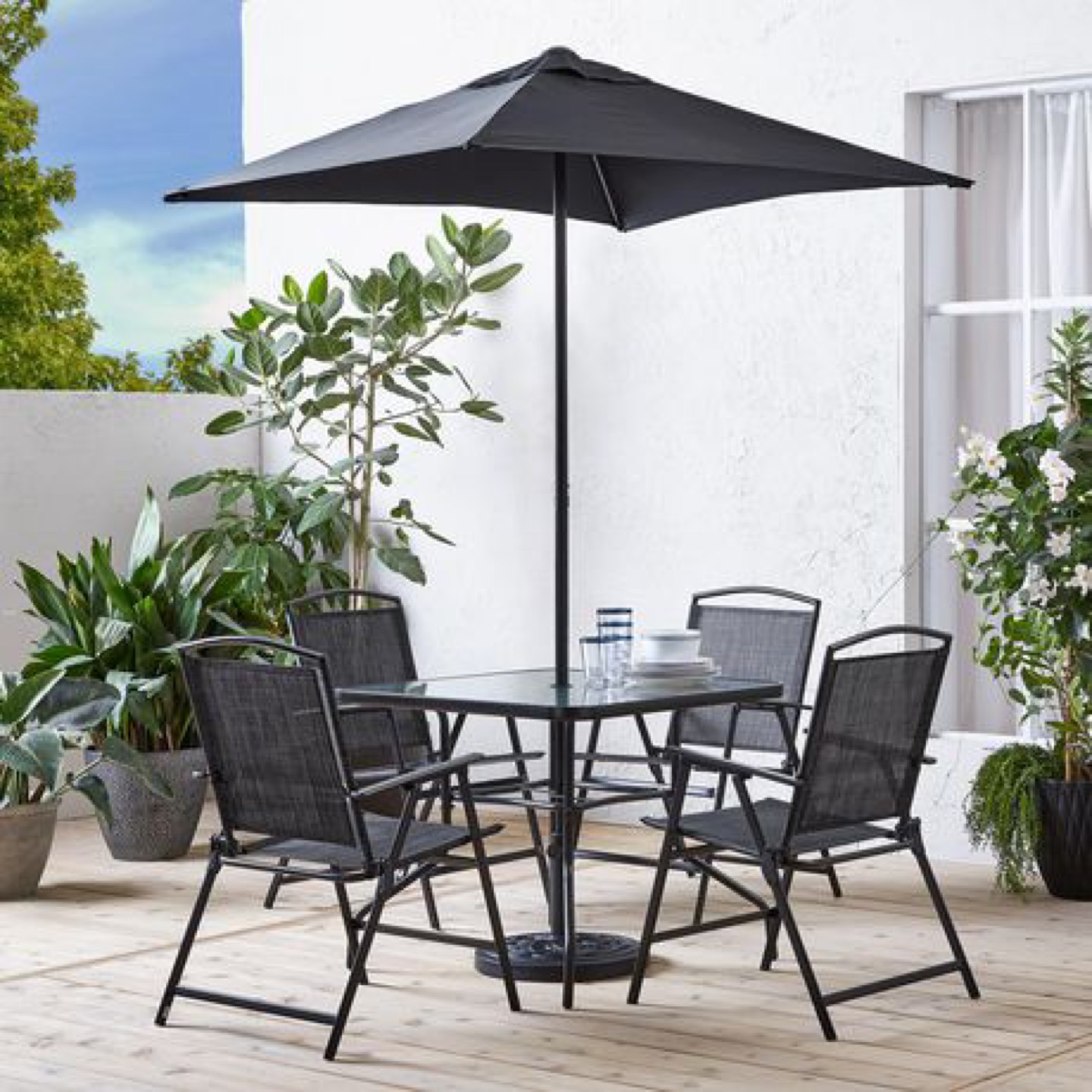 This outdoor dining set includes 4 folding chairs, a shatter-resistant glass tabletop, and a UV-resistant umbrella. You can have the green umbrella for free if you purchase the whole set. Pickup only:)