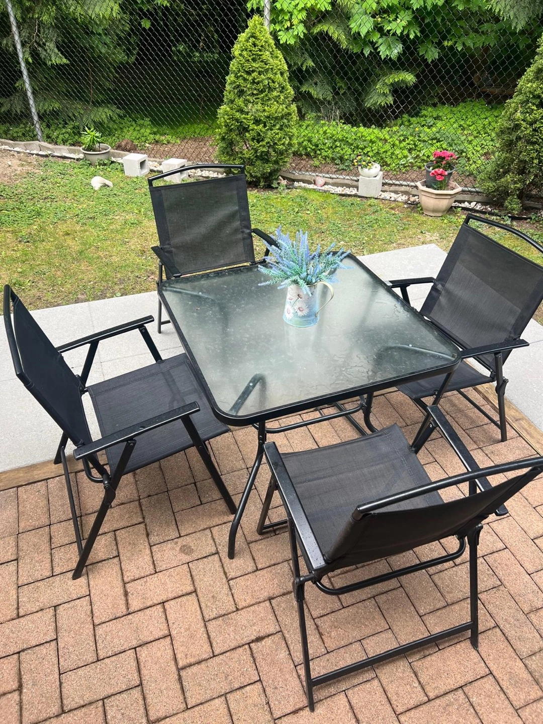 Black metal frame patio set. Four folding chairs. Glass tabletop. Suitable for small spaces. Great for balconies or patios. The handle of one chair tapped, but an easy fix.