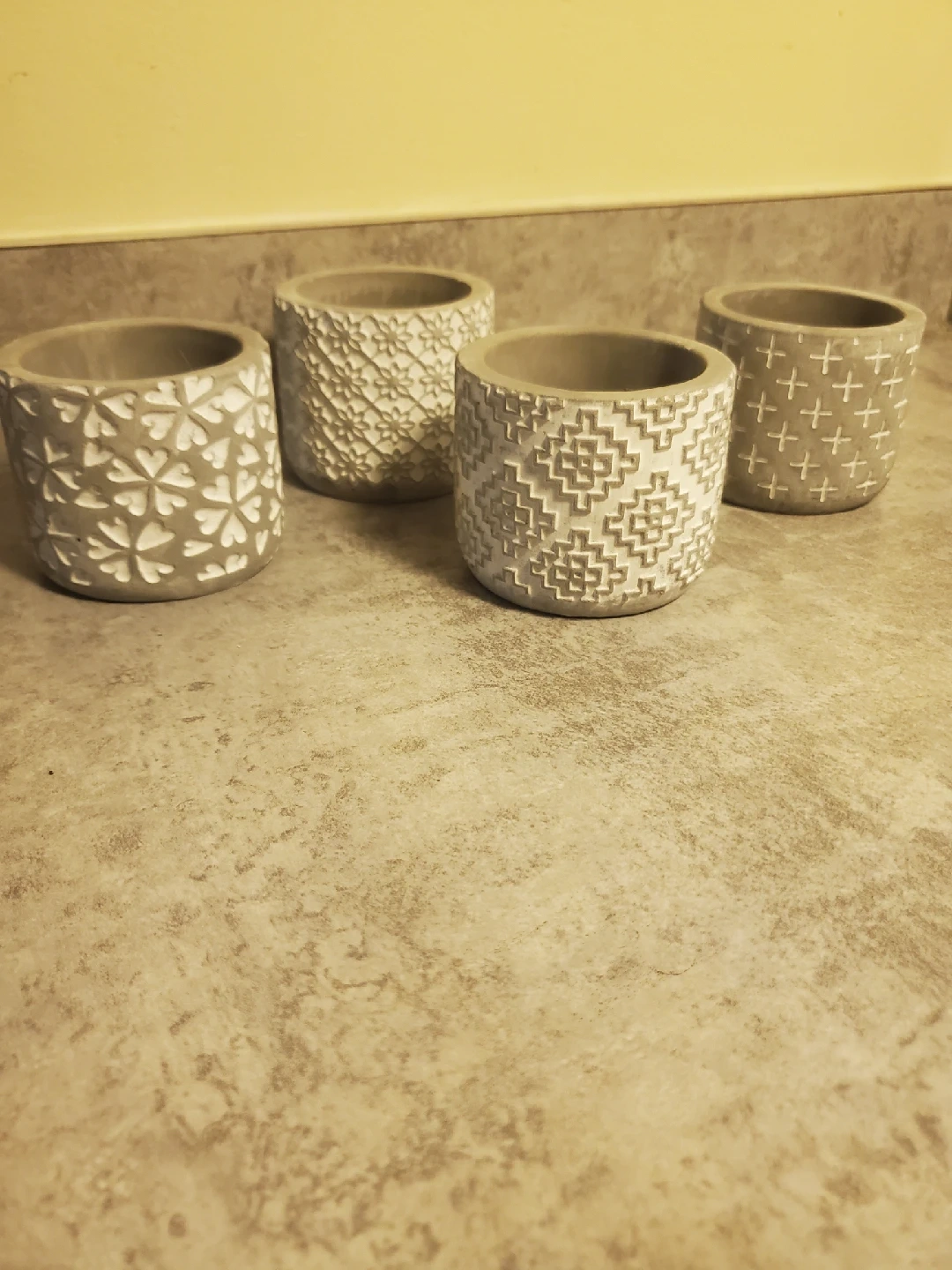 0Selling a set of 4 small cement plant pots. They have different decorative patterns on them. Perfect for succulents or small plants to add a touch of style to your home!
