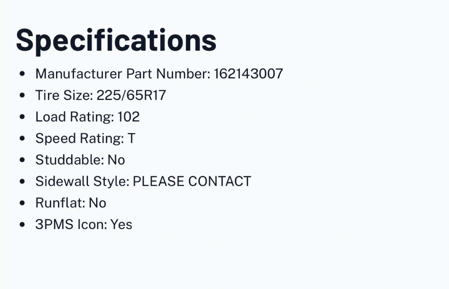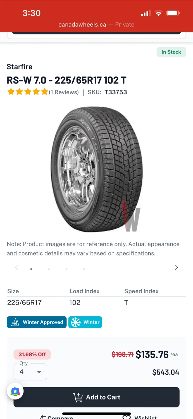 65NO RIMS INCLUDED Selling 1 set of FOUR Starfire RS-W 7.0 tires Purchased in Nov 2023, driven on for 2 winter seasons, still in good shape Key specs: - Tire Size: 225/65R17 - Load Rating: 102 - Speed Rating: T - Studdable: No