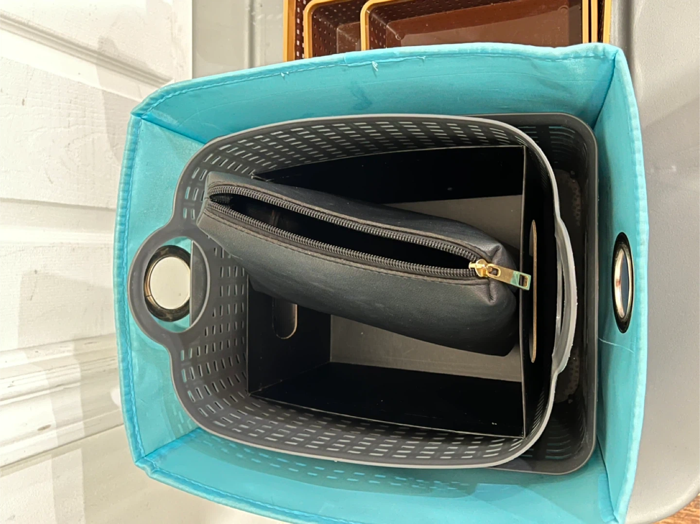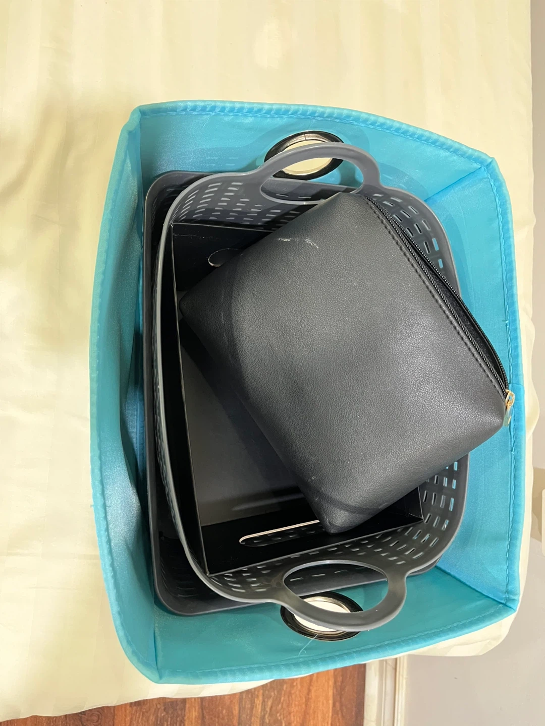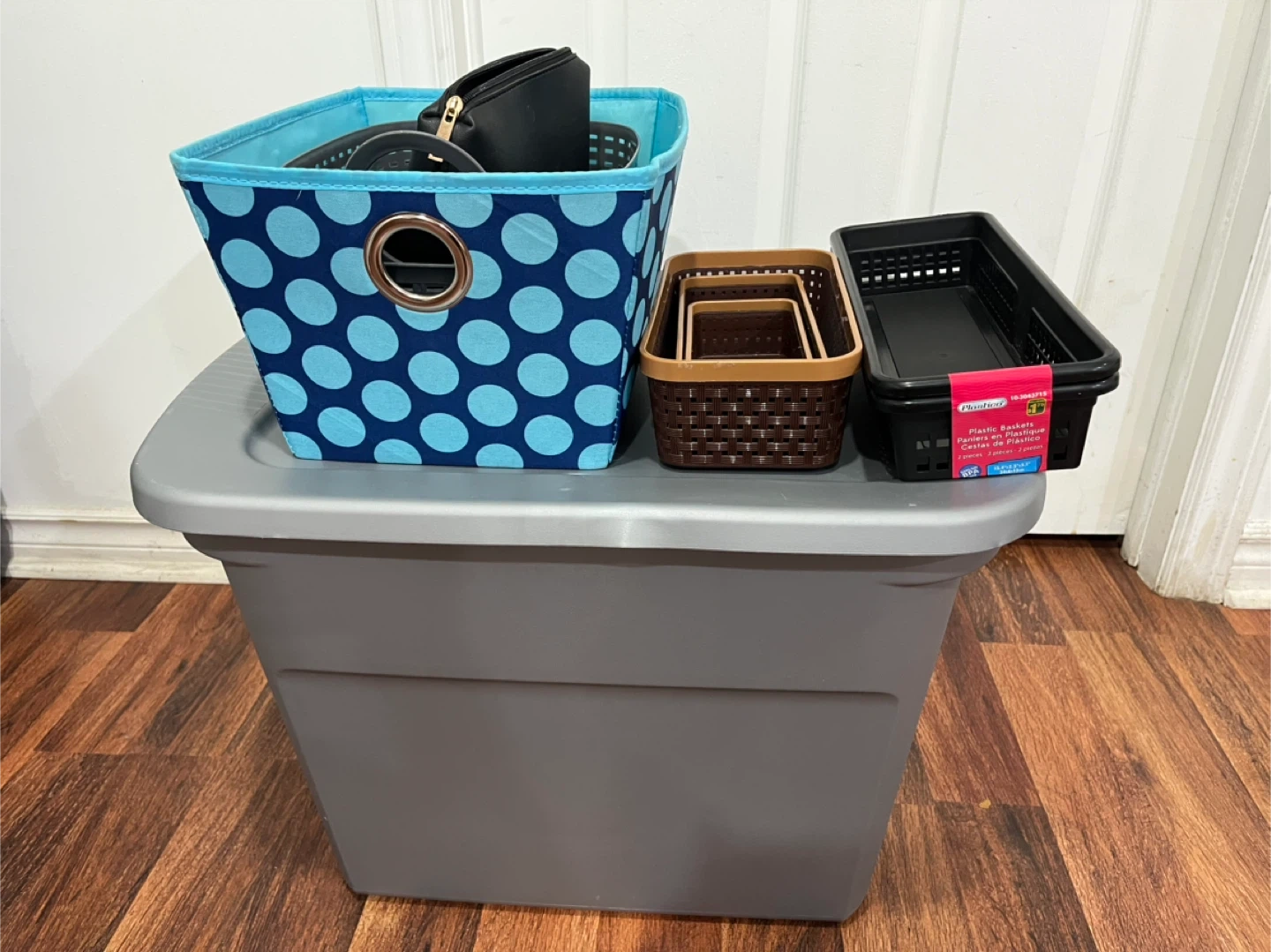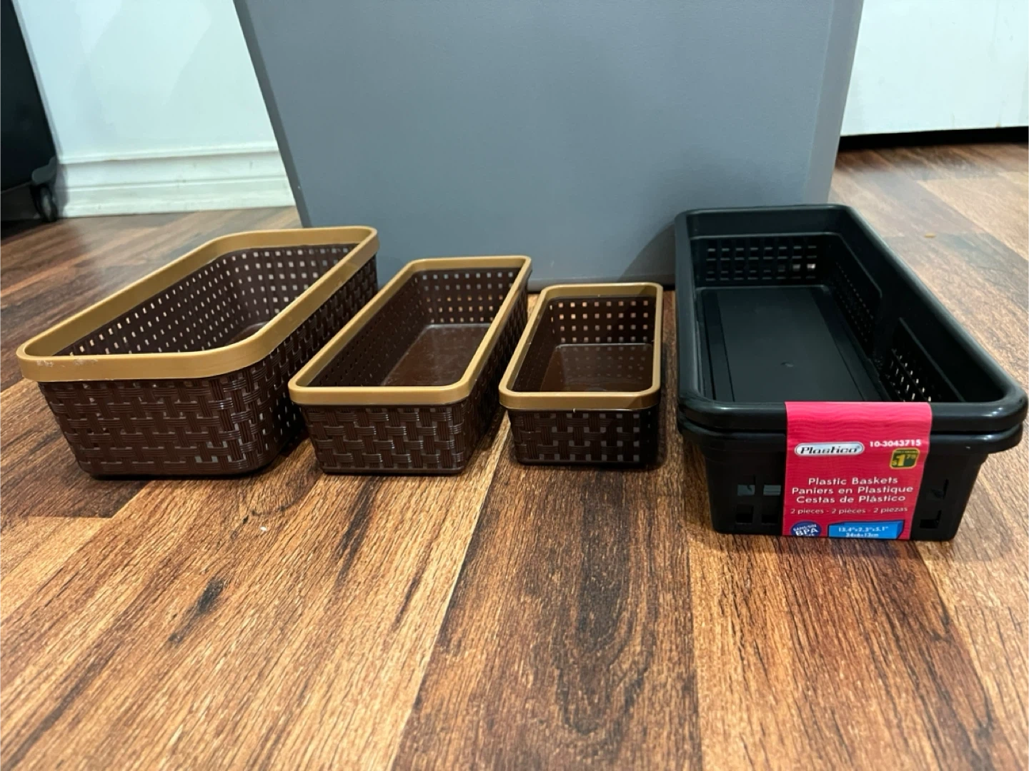 4 storage baskets, 5 drawer/dresser organiser baskets, 1 large pouch and 1 big storage tote, good for organising stuff Details:- 2 basket from dollarama 1 blue basket from shoppers drug mart 1 very good quality large pouch 1 big sterlite storage tote 2 long basket from dollarama for drawer and dresser organiser 3 coffee brown nakoda (India) drawer and dresser organiser